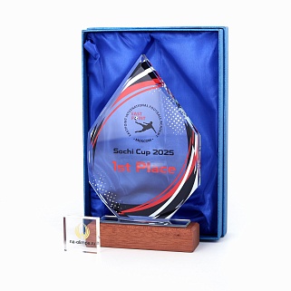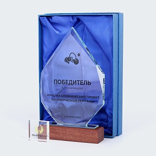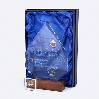 Стеклянная награда с полноцветным нанесением. Толщина стекла 15 мм. Может доукомплектовываться металлической или заливной табличкой с текстом и рисунком. Табличка в комплект не входит и заказывается отдельно. Поставляется в комплекте с подарочным футляром. Вес награды без футляра 735гр. Стоимость указана за нанесение на одной стороне, печать выполняется на задней стенке награды.