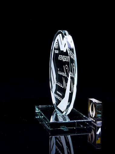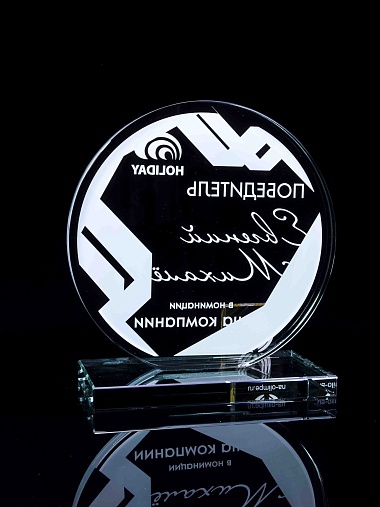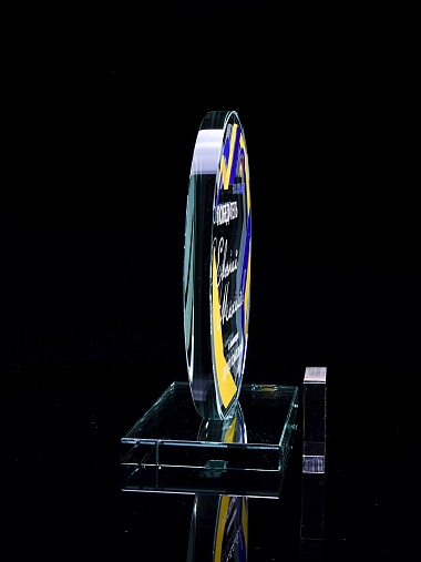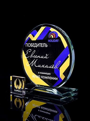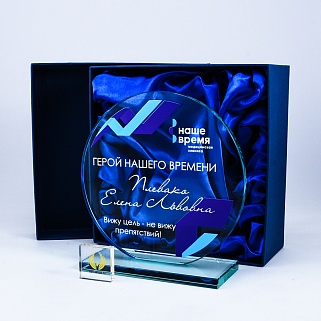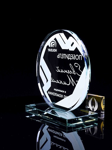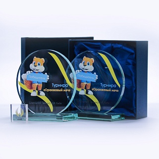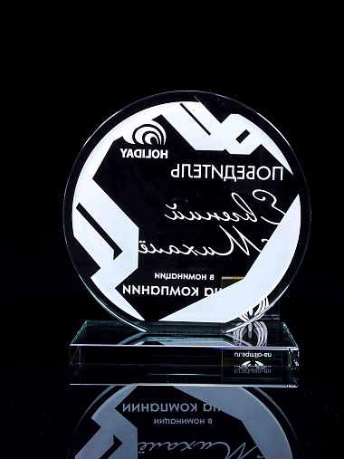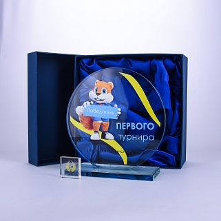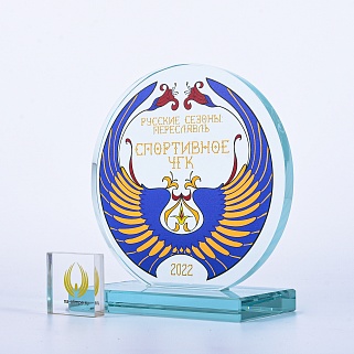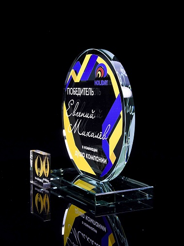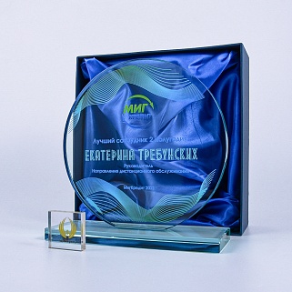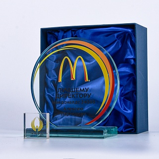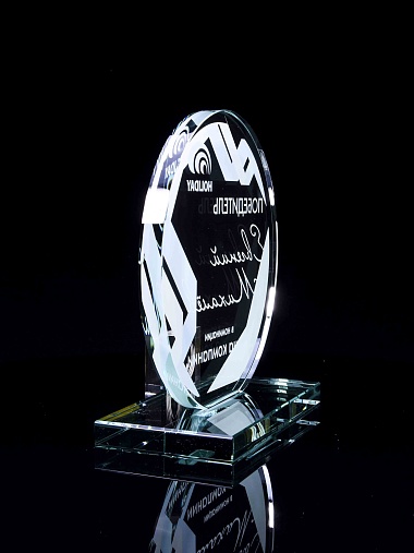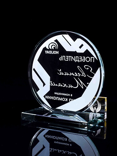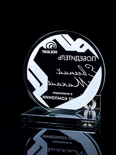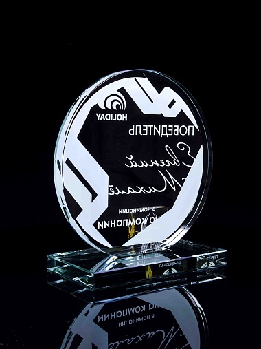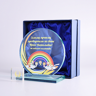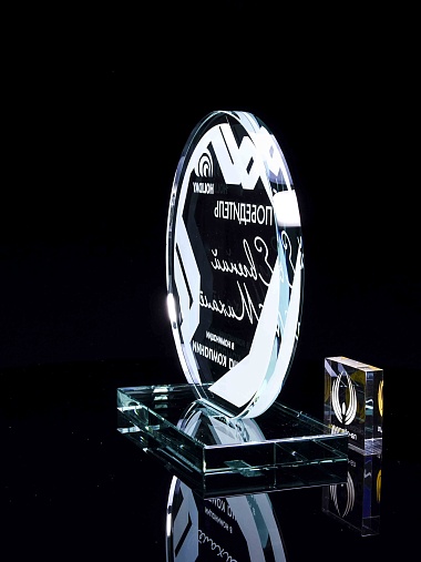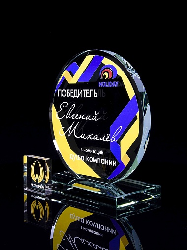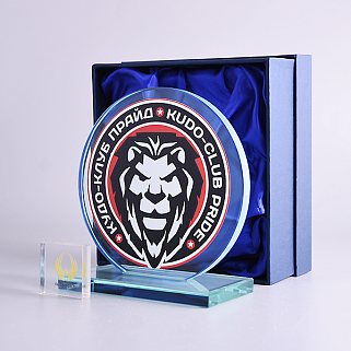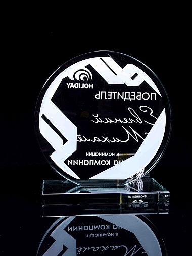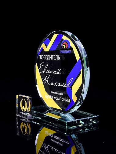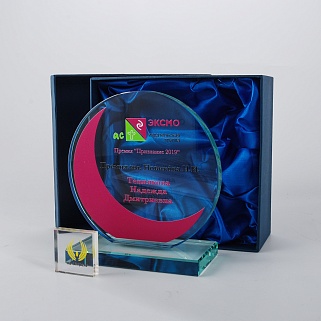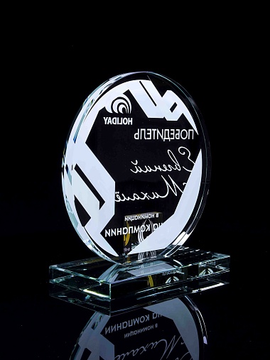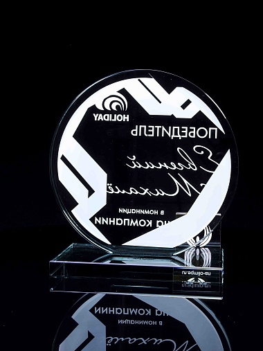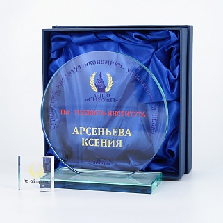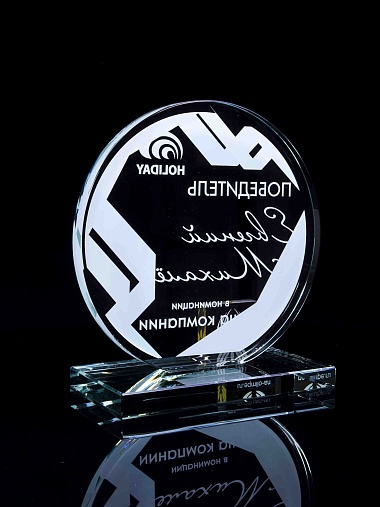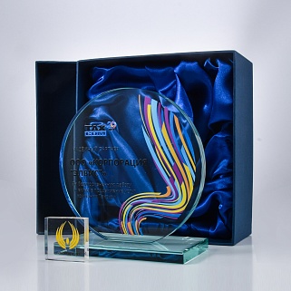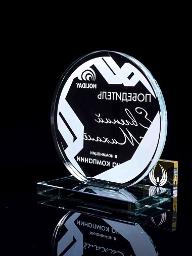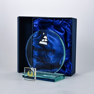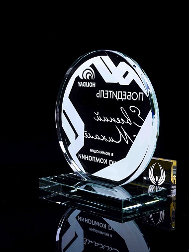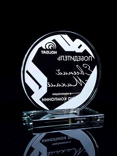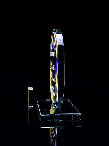 Стеклянная награда с полноцветным нанесением. Толщина стекла 12 мм. Поставляется в комплекте с подарочным футляром. Вес награды без футляра 1340гр. Стоимость указана за нанесение на одной стороне, печать выполняется на передней стенке награды.