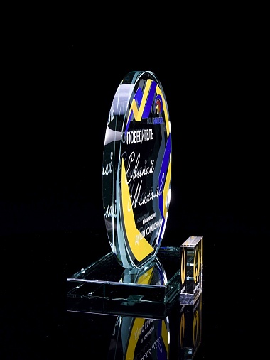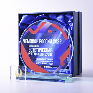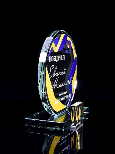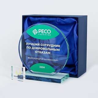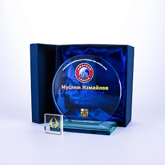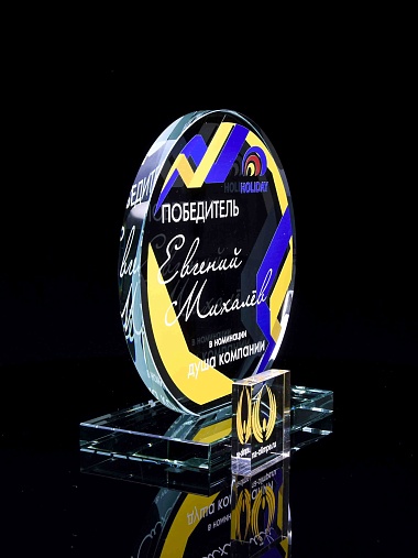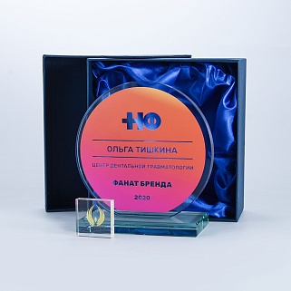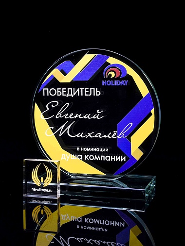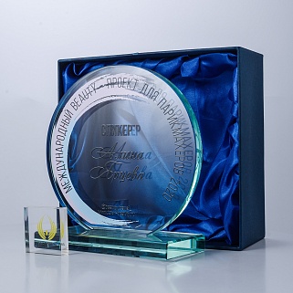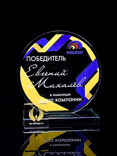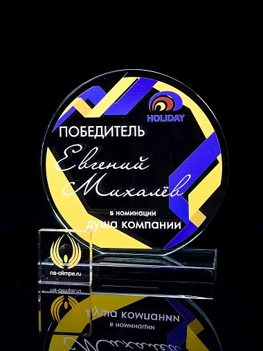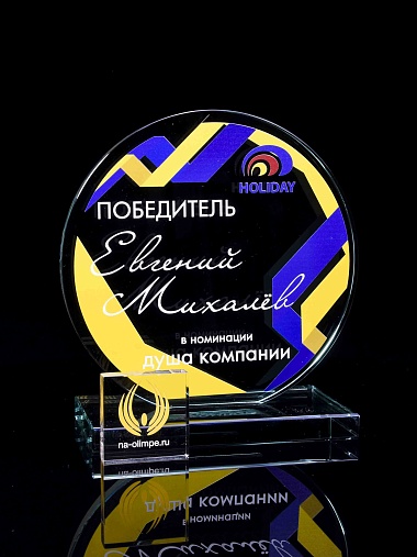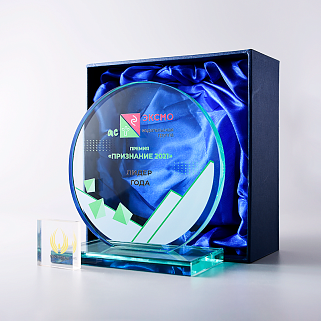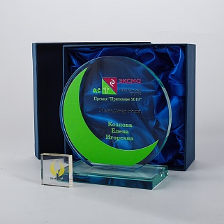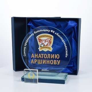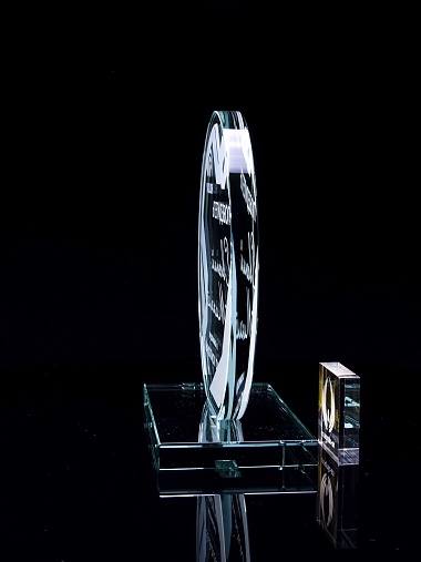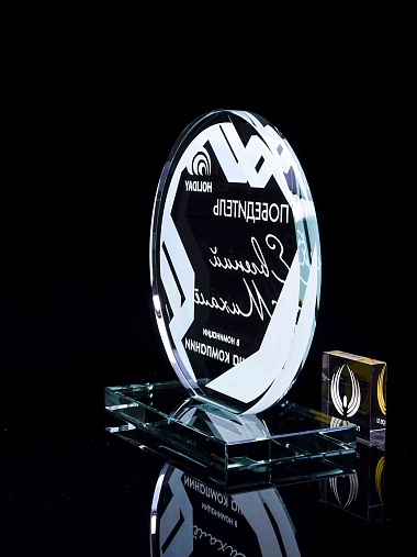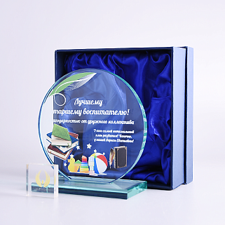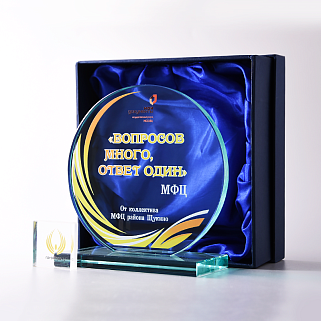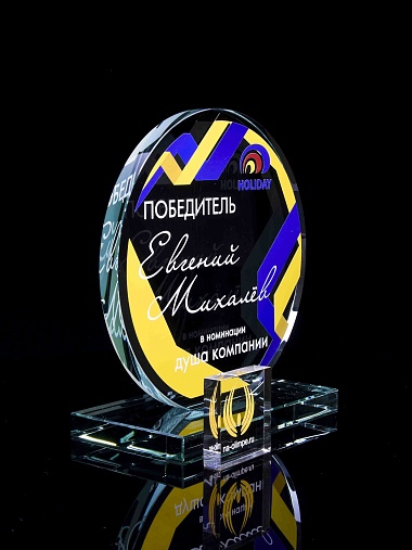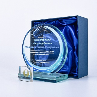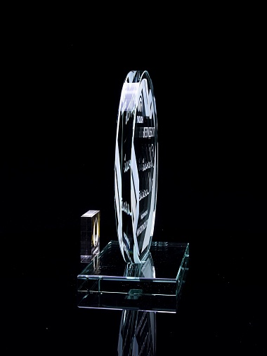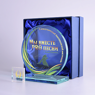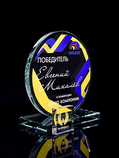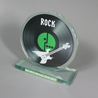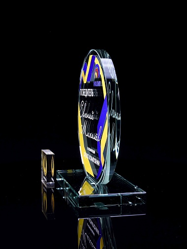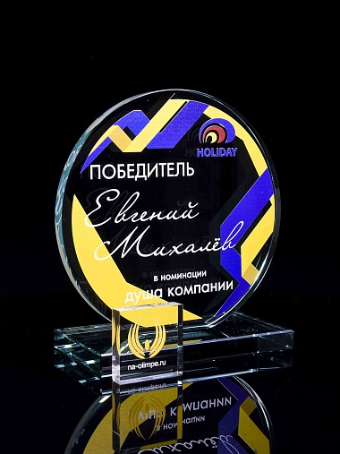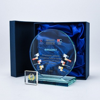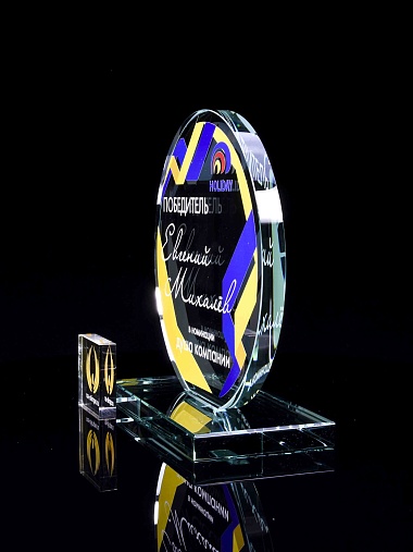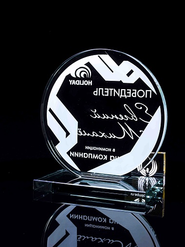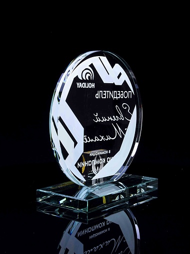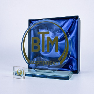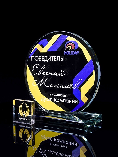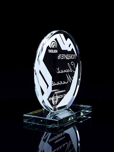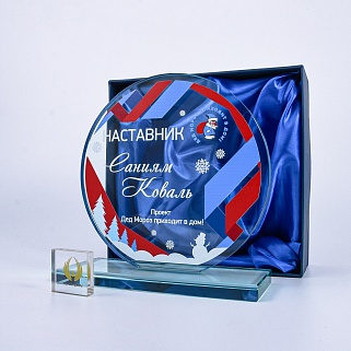Стеклянная награда с полноцветным нанесением. Толщина стекла 12 мм. Поставляется в комплекте с подарочным футляром. Вес награды без футляра 1340гр. Стоимость указана за нанесение на одной стороне, печать выполняется на передней стенке награды.