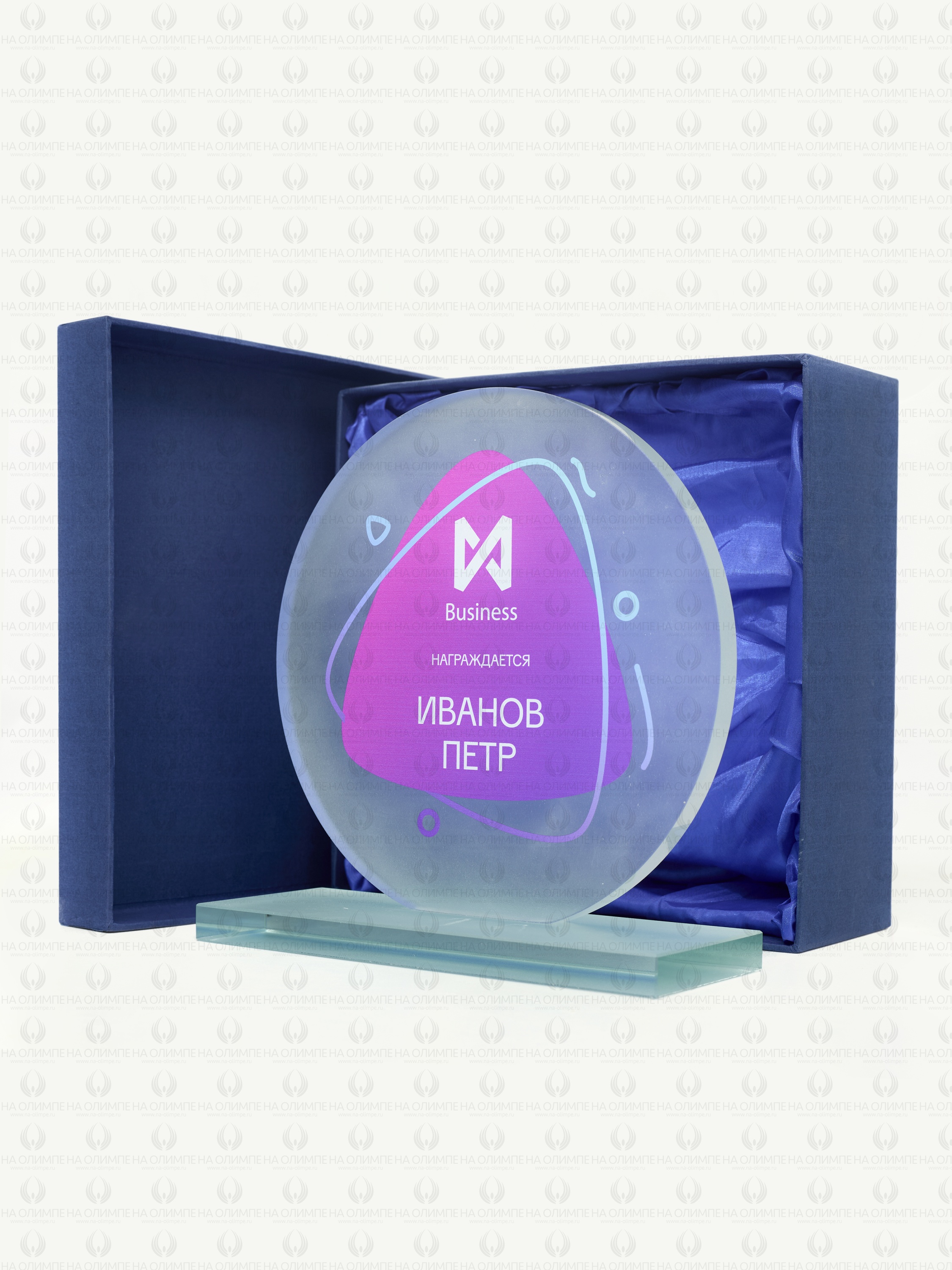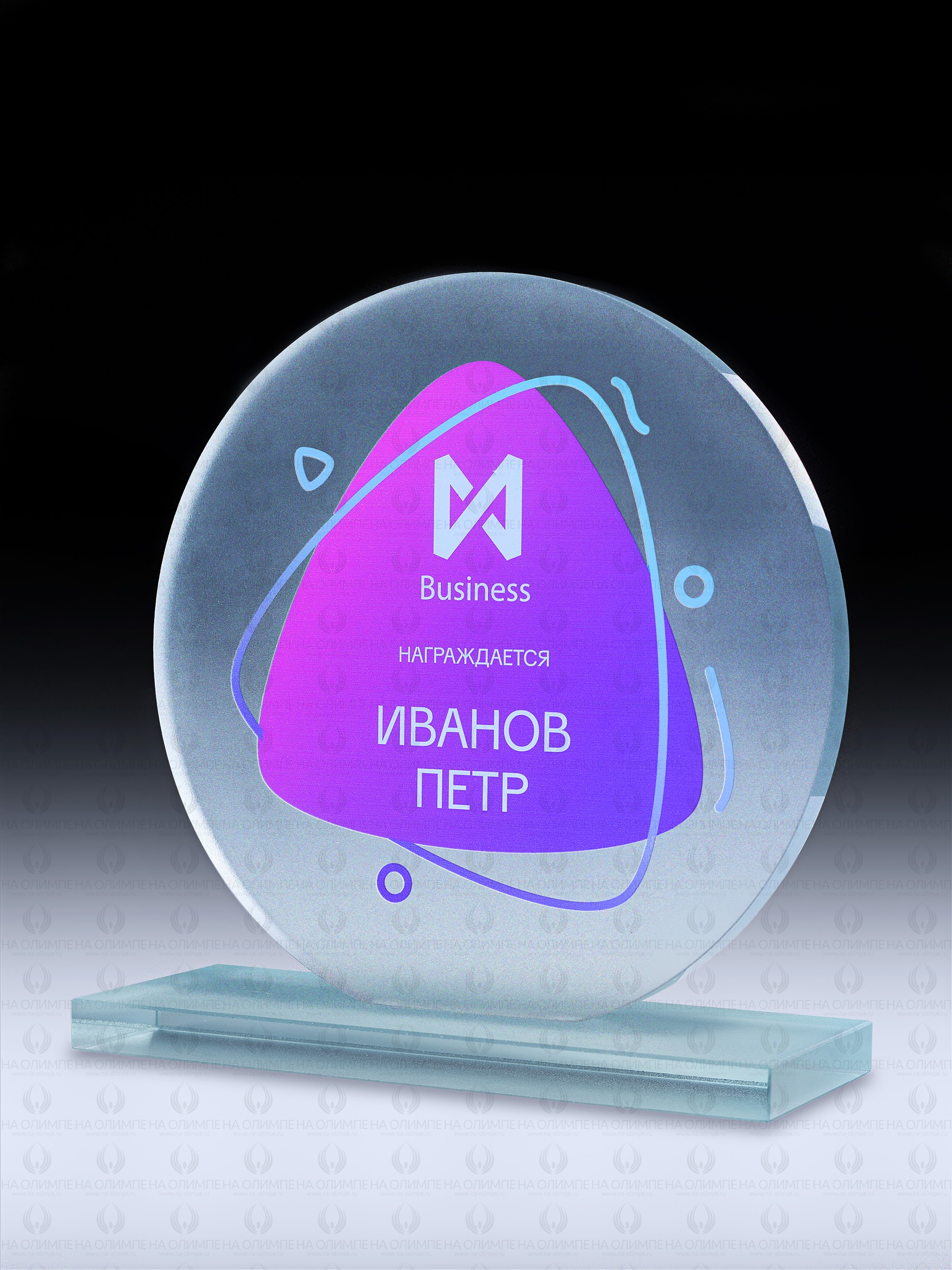 Награда из стекла с матированной поверхностью и полноцветной печатью. Толщина стекла 12 мм. Поставляется в комплекте с подарочным футляром. Вес награды без футляра 1340гр. Стоимость указана за нанесение на одной стороне, печать выполняется на передней стенке награды.