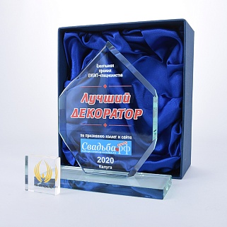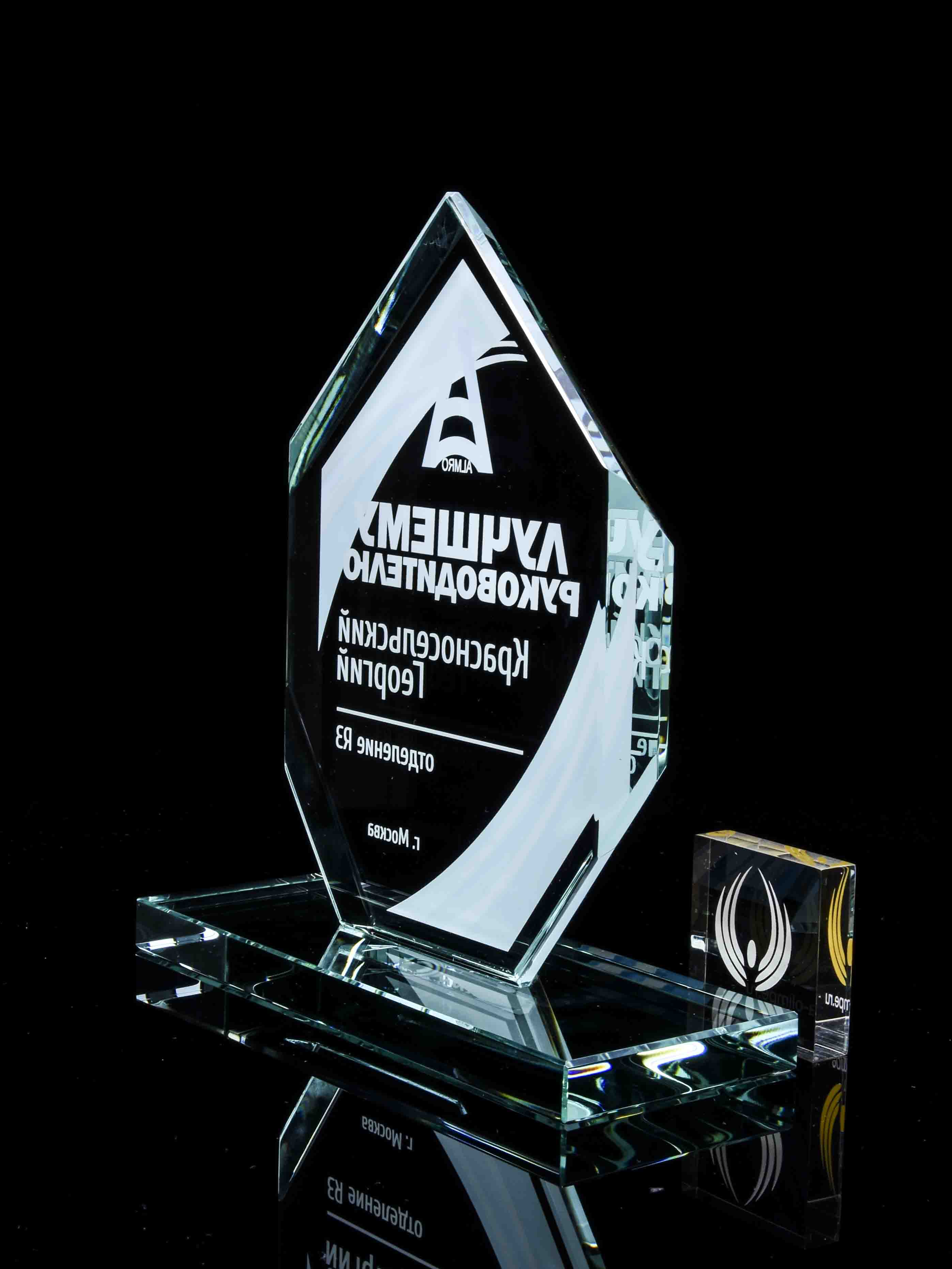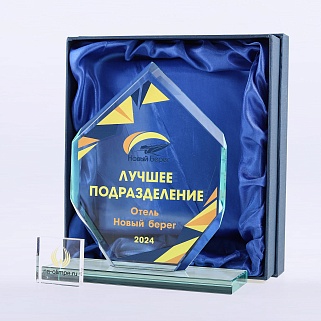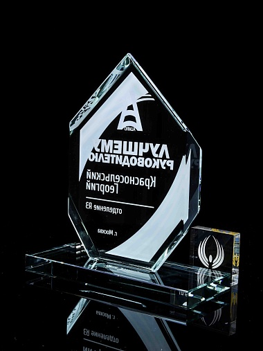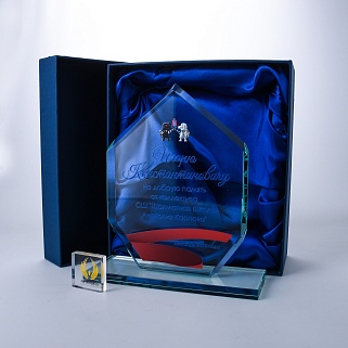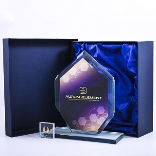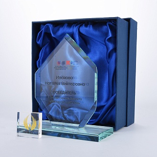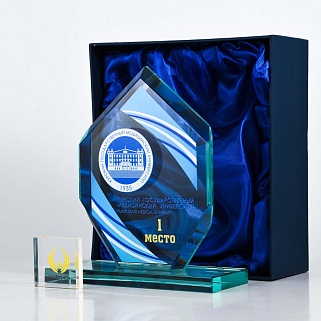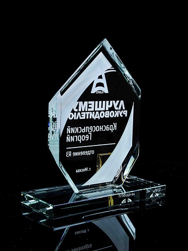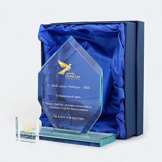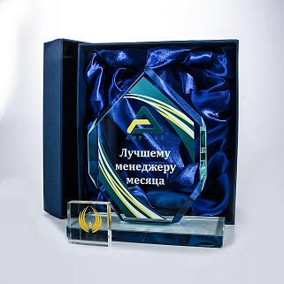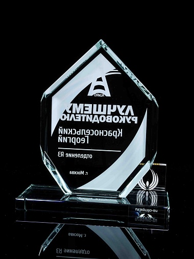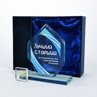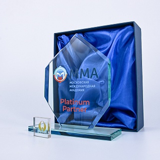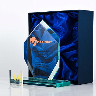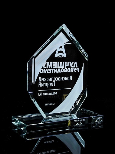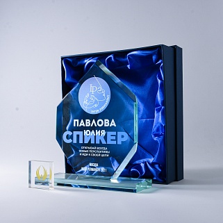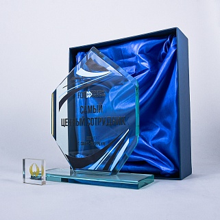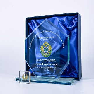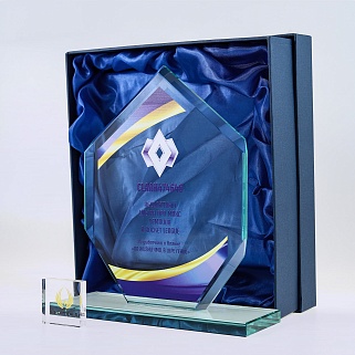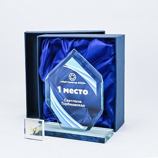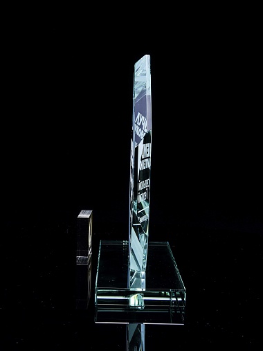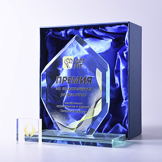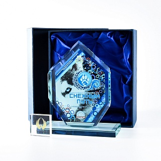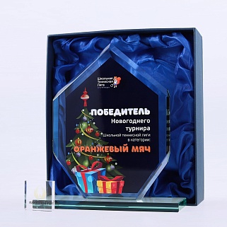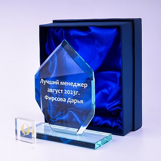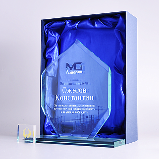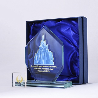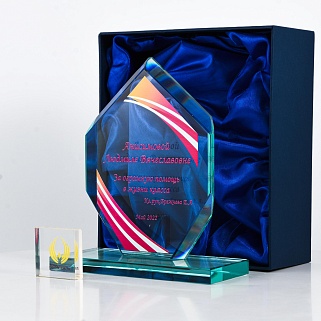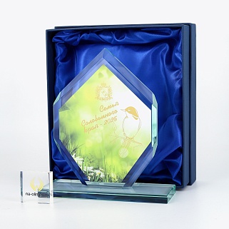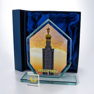Стеклянная награда с полноцветным нанесением. Толщина стекла 12 мм. Поставляется в комплекте с подарочным футляром. Вес награды без футляра 819гр. Стоимость указана за нанесение на одной стороне, печать выполняется на передней стенке награды.