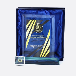 Стеклянная награда с полноцветным нанесением. Толщина стекла 19 мм. Поставляется в комплекте с подарочным футляром. Вес награды без футляра 1550гр. Стоимость указана за нанесение на одной стороне, печать выполняется на передней стенке награды.