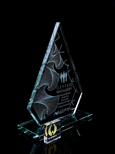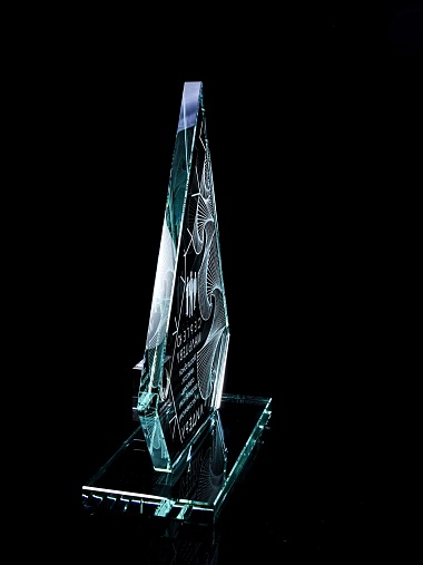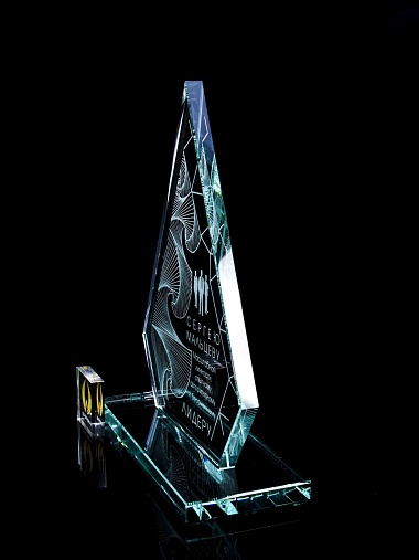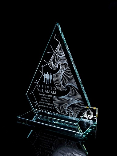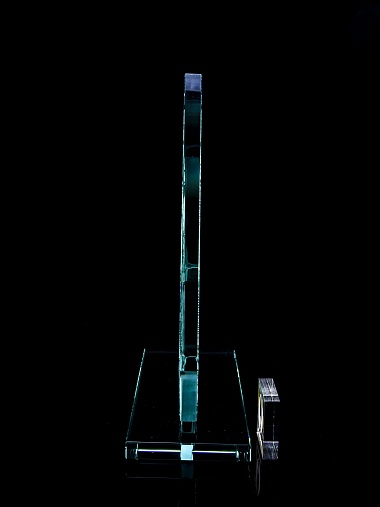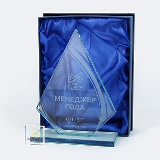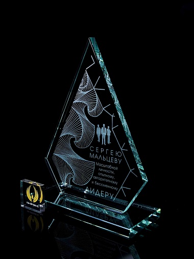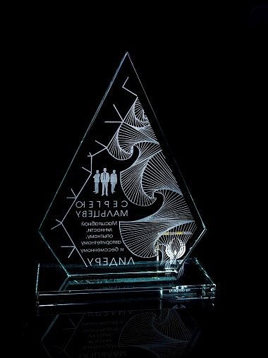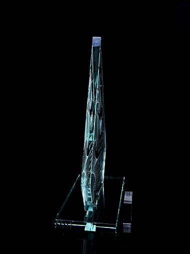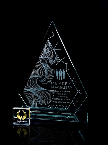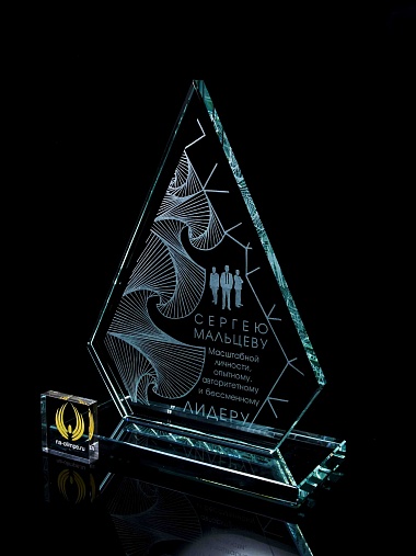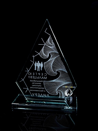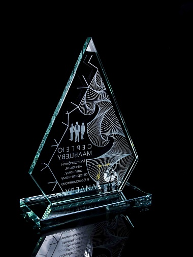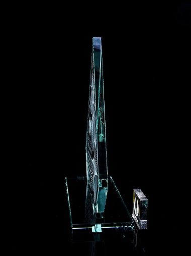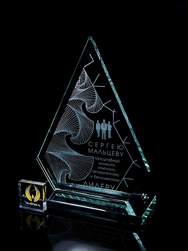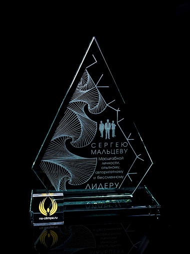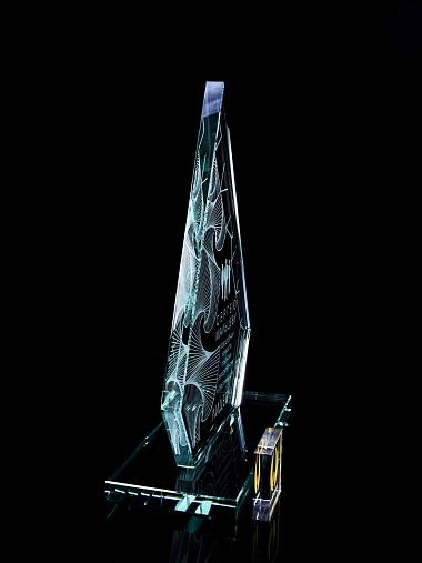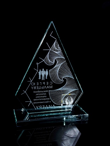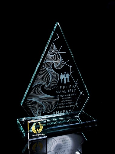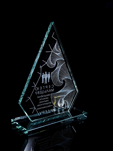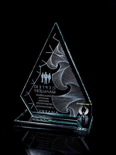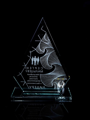 Стеклянная награда с гравировкой. Толщина стекла 12 мм. Поставляется в комплекте с подарочным футляром. Вес награды без футляра 1100гр. Стоимость указана за нанесение на одной стороне, гравировка выполняется на передней стенке награды.
