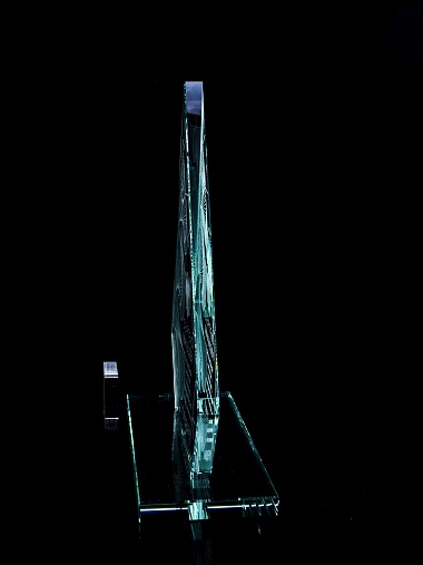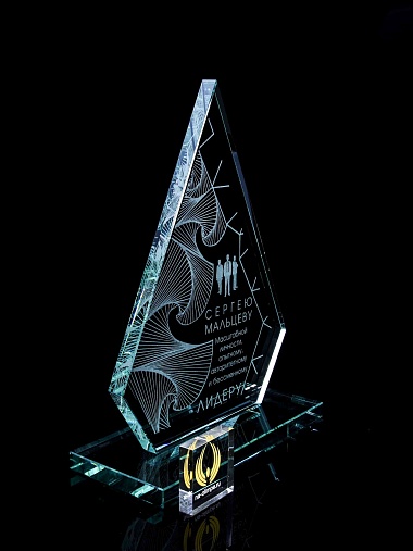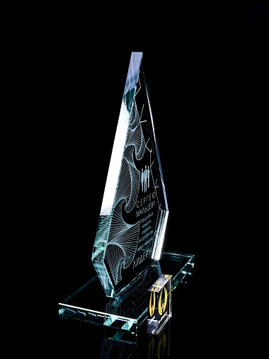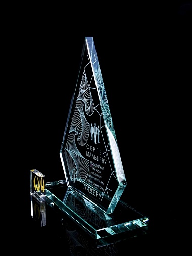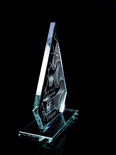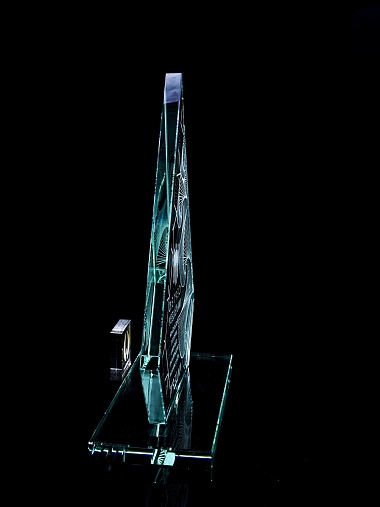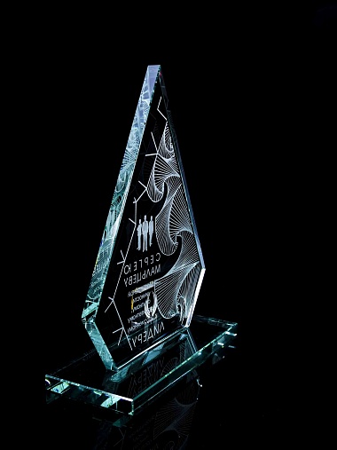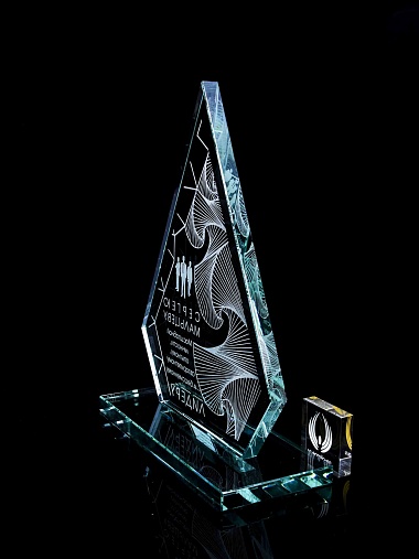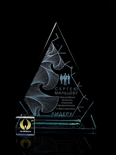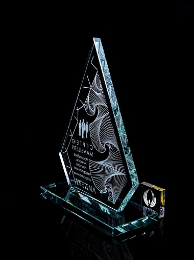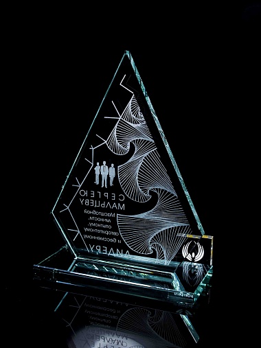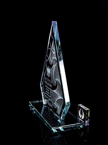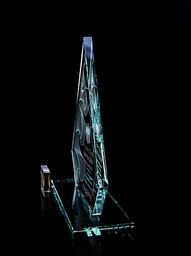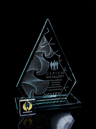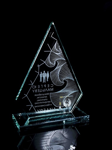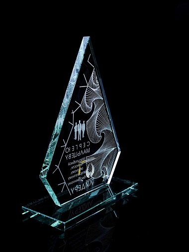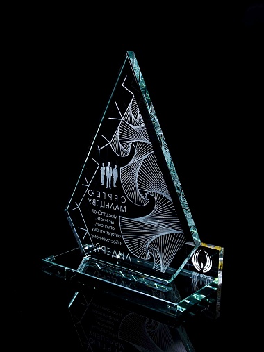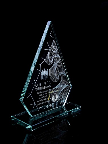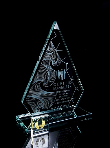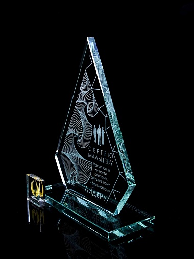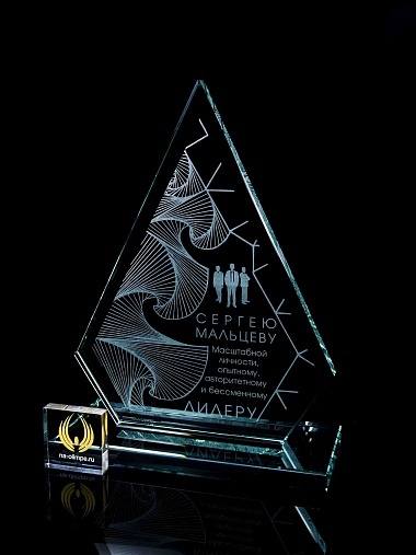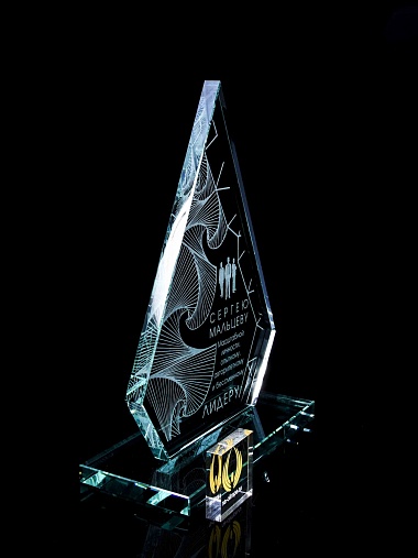 Стеклянная награда с гравировкой. Толщина стекла 12 мм. Поставляется в комплекте с подарочным футляром. Вес награды без футляра 1100гр. Стоимость указана за нанесение на одной стороне, гравировка выполняется на передней стенке награды.