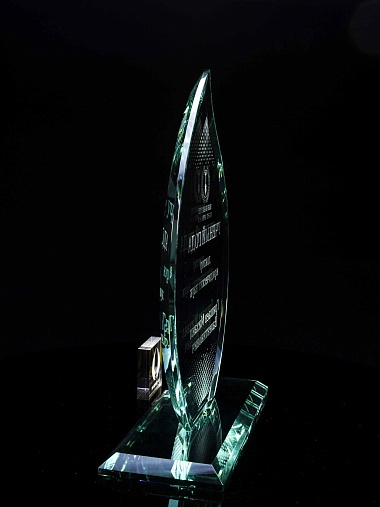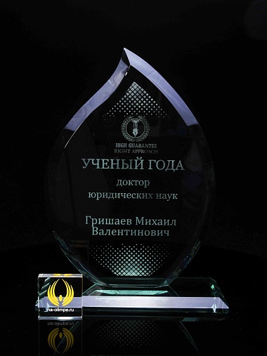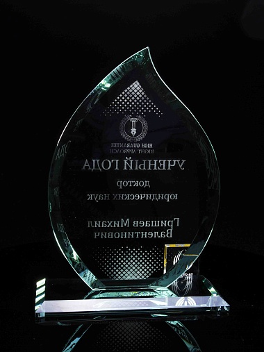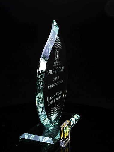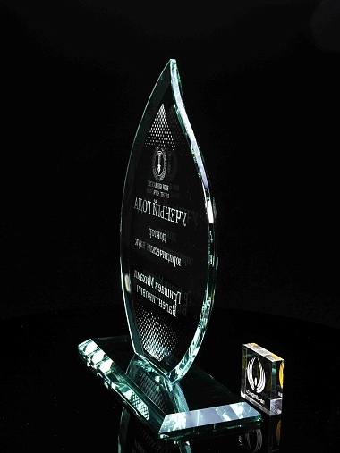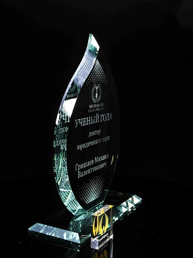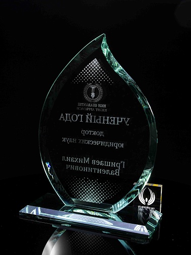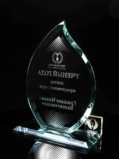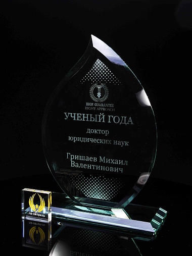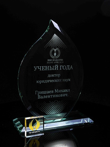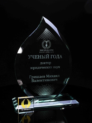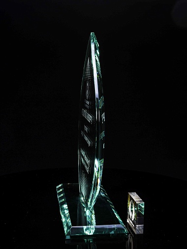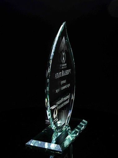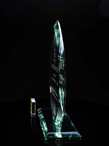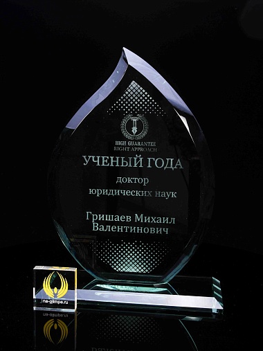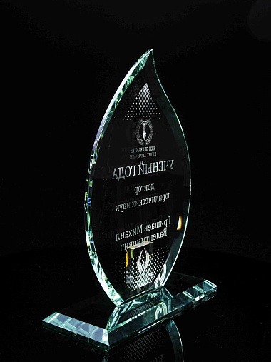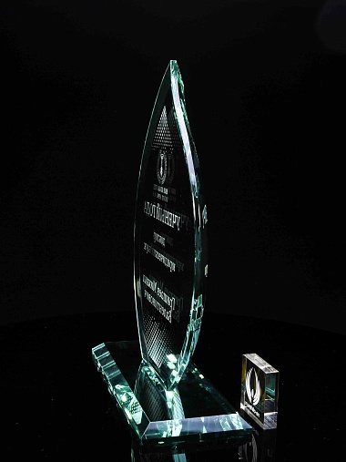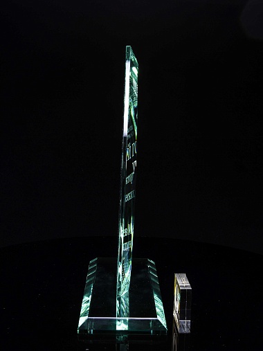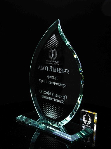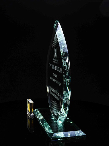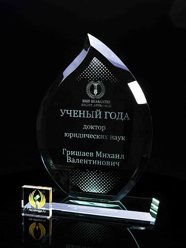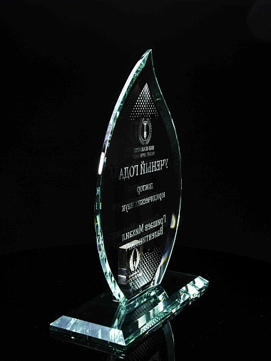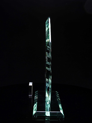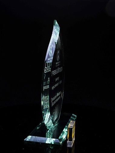 Стеклянная награда с гравировкой. Толщина стекла 12 мм. Поставляется в комплекте с подарочным футляром. Вес награды без футляра 1120гр.  Стоимость указана за нанесение на одной стороне, гравировка выполняется на передней стенке награды.