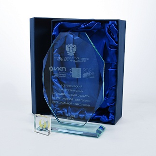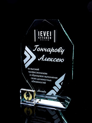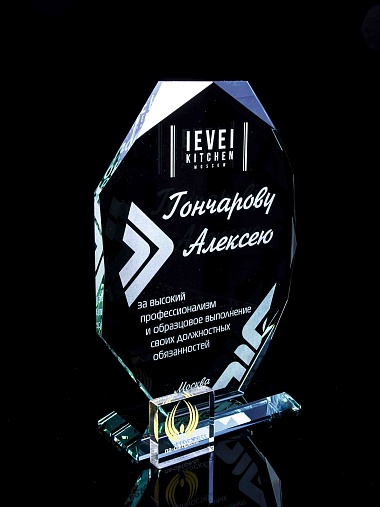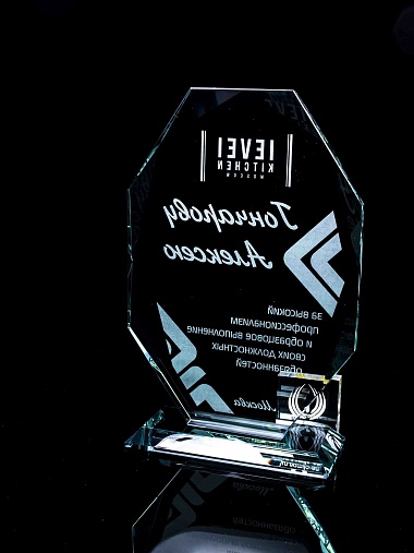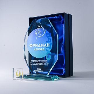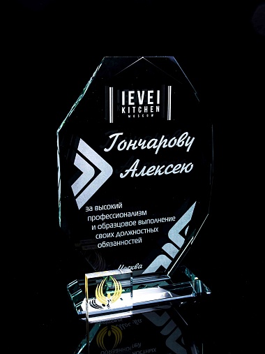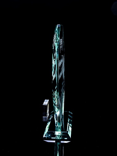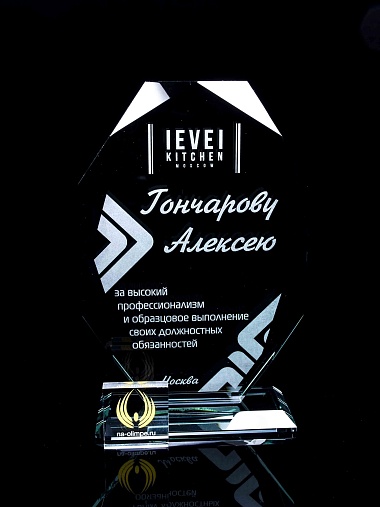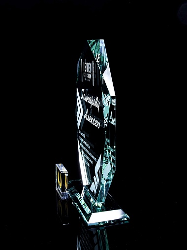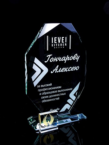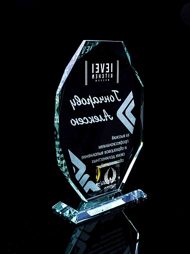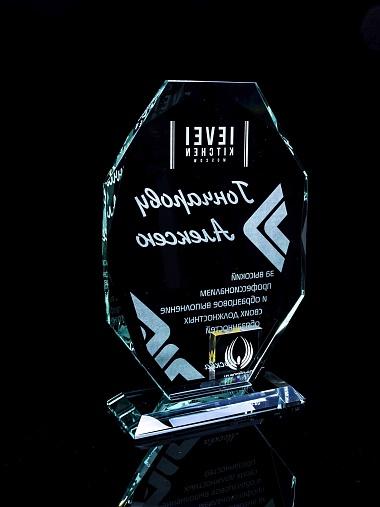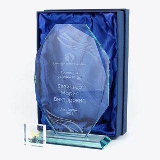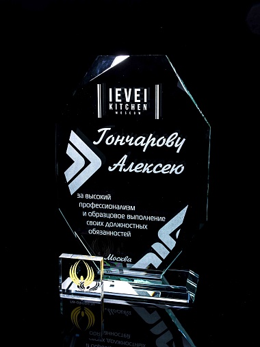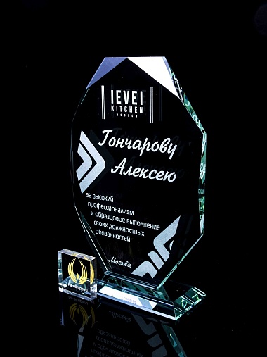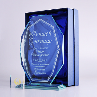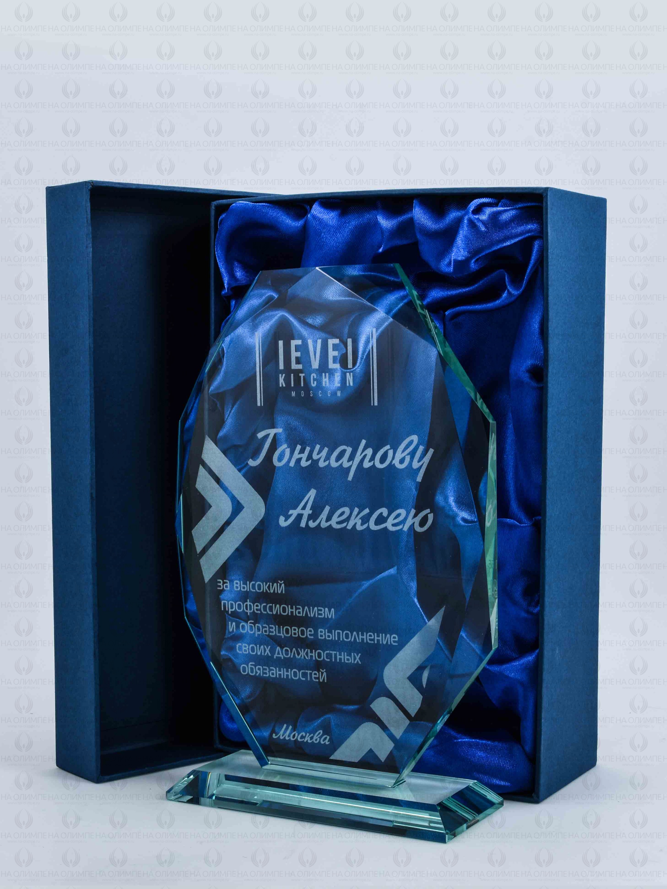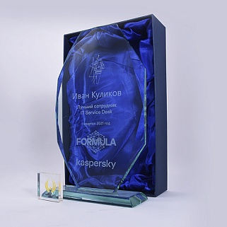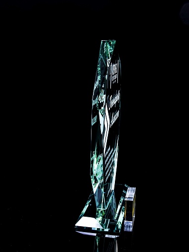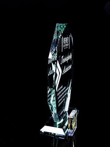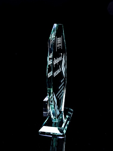 Стеклянная награда с гравировкой. Толщина стекла 12 мм. Поставляется в комплекте с подарочным футляром. Вес награды без футляра 916гр. Стоимость указана за нанесение на одной стороне, гравировка выполняется на передней стенке награды.