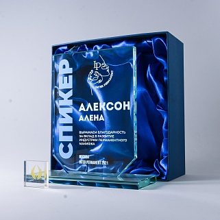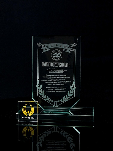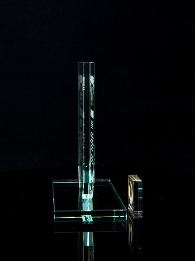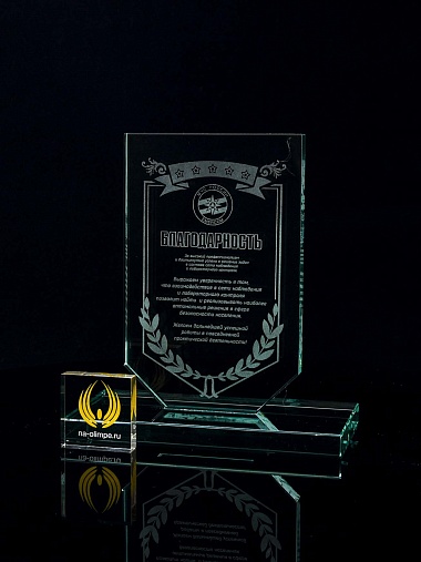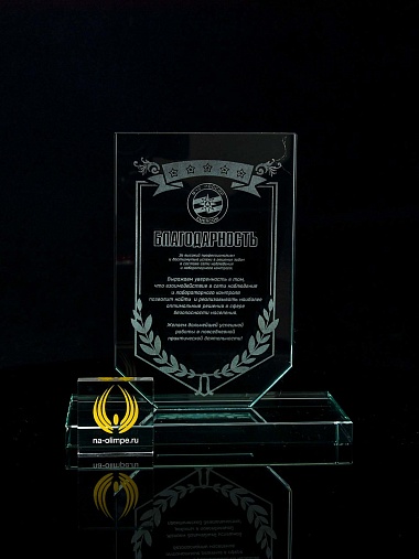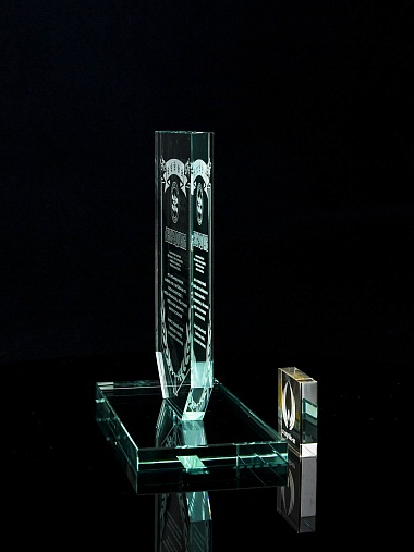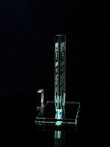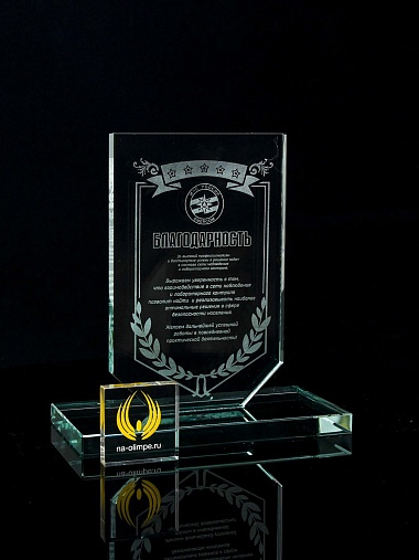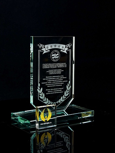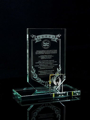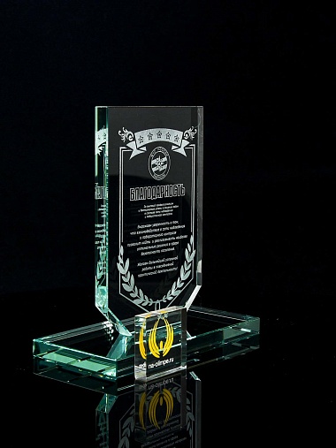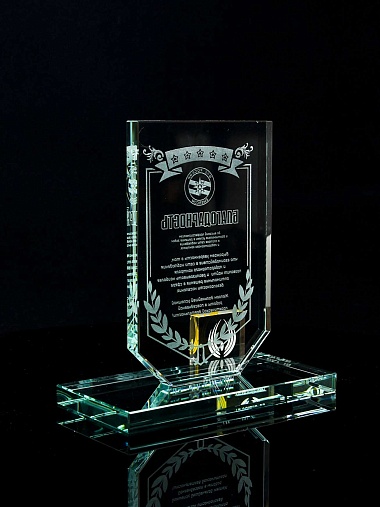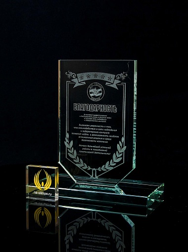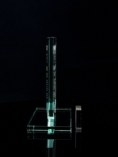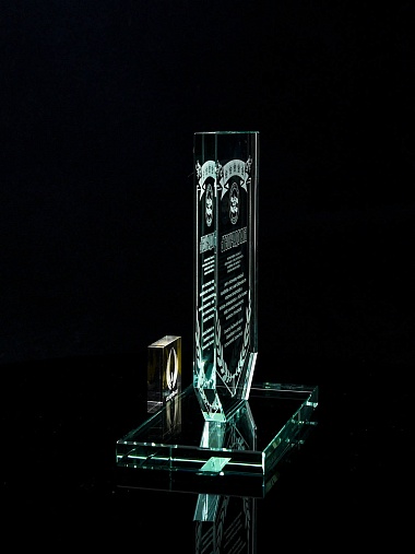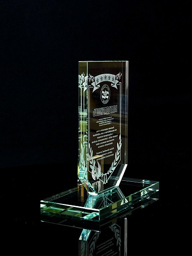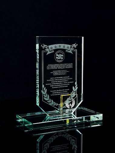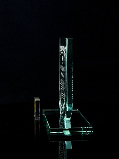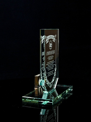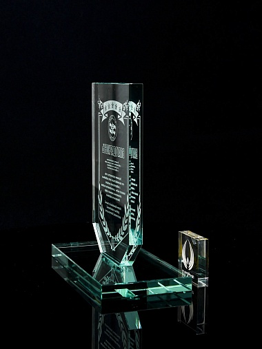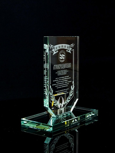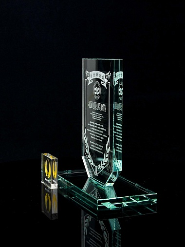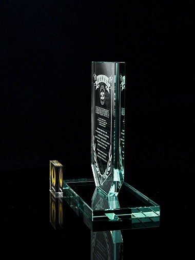 Стеклянная награда с лазерной гравировкой. Поставляется в комплекте с подарочным футляром. Толщина стекла 12 мм. Вес награды без футляра 790гр. Стоимость указана за нанесение на одной стороне, гравировка выполняется на передней стенке награды.