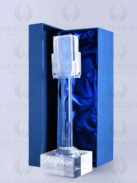 Стеклянная награда с гравировкой. Поставляется в комплекте с подарочным футляром. Вес награды без футляра 1100гр. Стоимость указана за нанесение на одной стороне, печать выполняется на передней стенке награды.