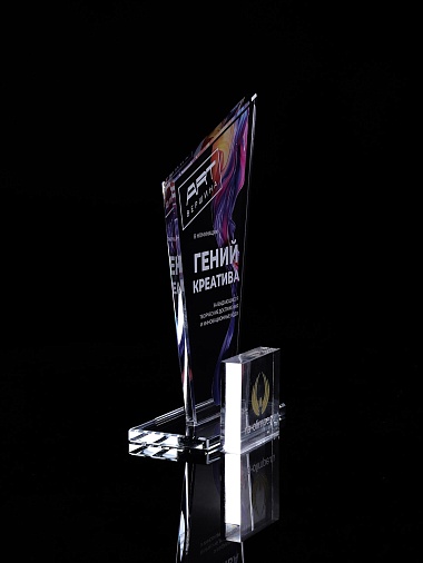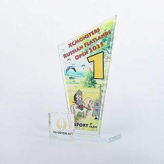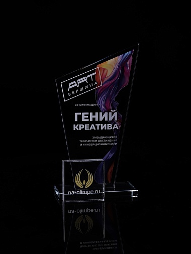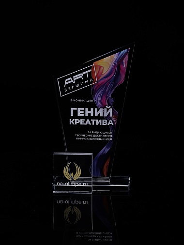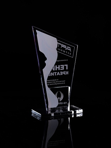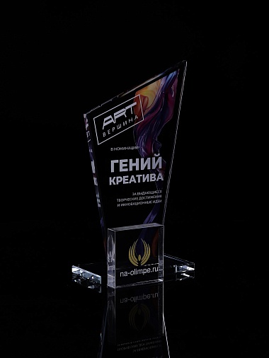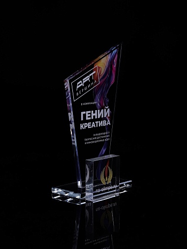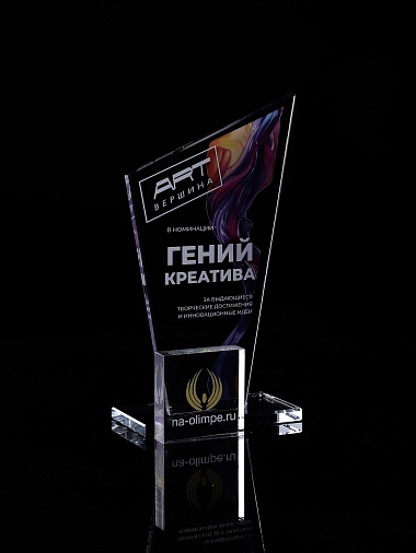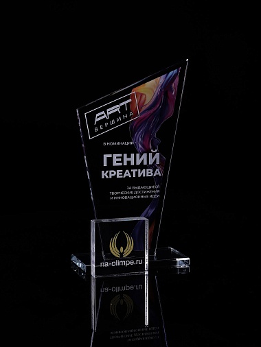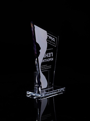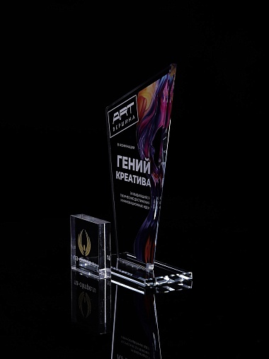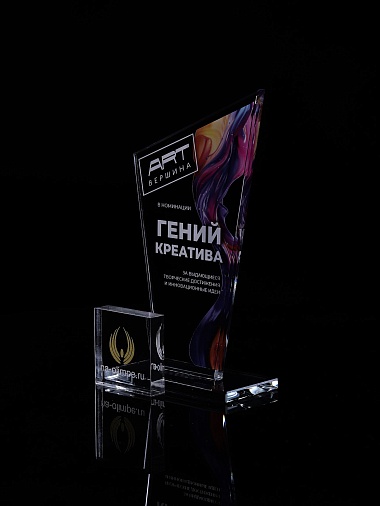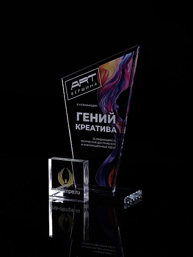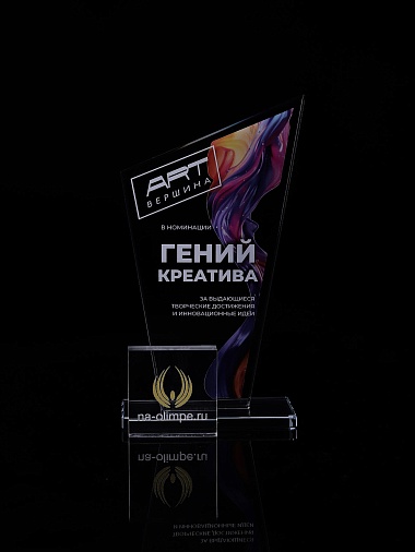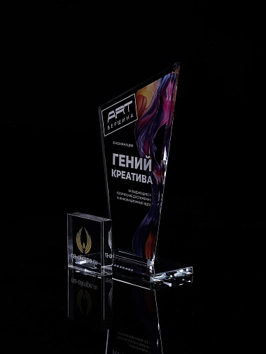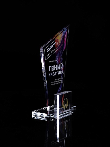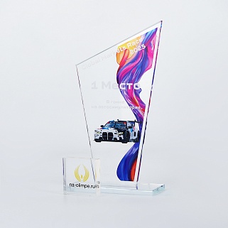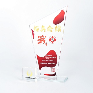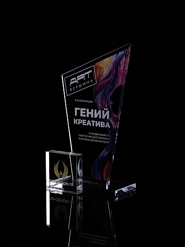 Стеклянная награда с полноцветным нанесением. Толщина стекла 6 мм. Стоимость указана за нанесение на одной стороне, печать выполняется на задней стенке награды. Поставляется в крафтовой коробке.