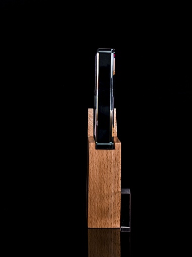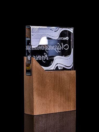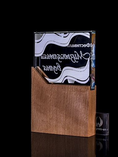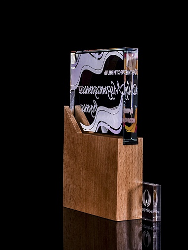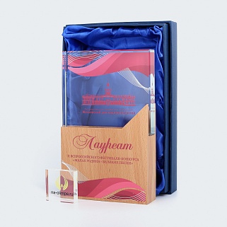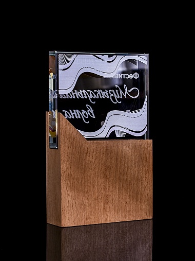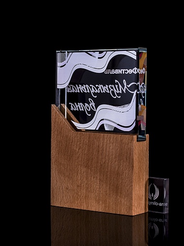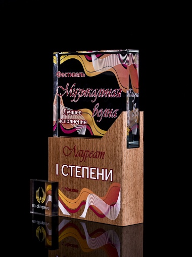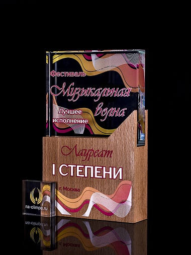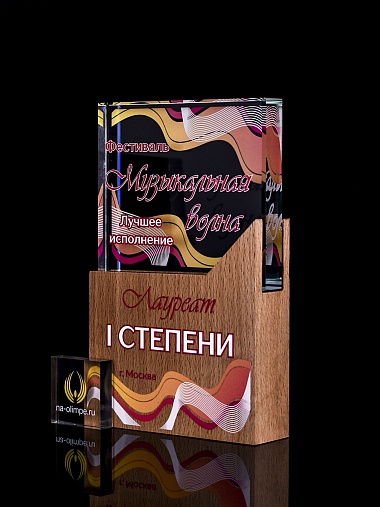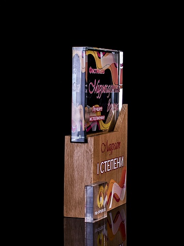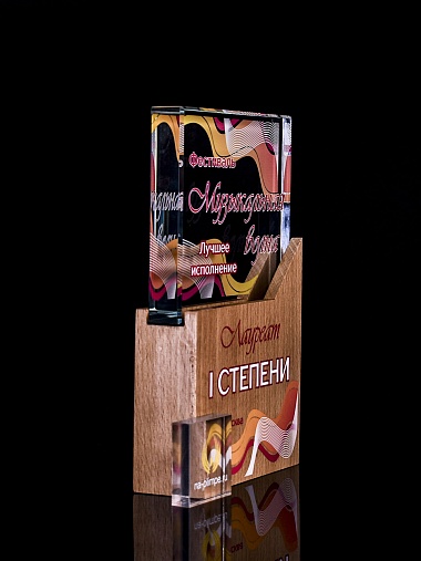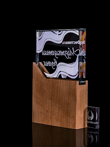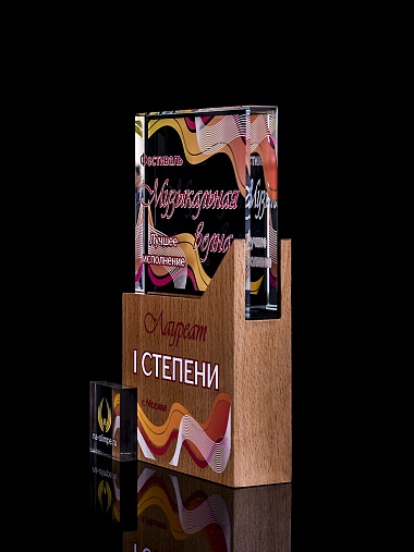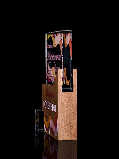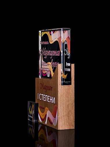 Награда из стекла и дерева с полноцветным нанесением по вашему запросу. Толщина стекла 20 мм. Вес награды без футляра 850гр.