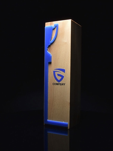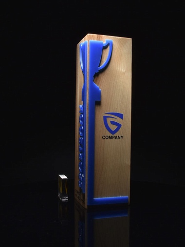 Естественный цвет дерева будет хорошо смотреться в любом интерьере. Персонализированное нанесение выполнено гравировкой по дереву. Награда декорирована синим пластиком. Стоимость указана за нанесение на одной стороне. Возможность нанесения на дополнительной стороне и стоимость этих работ можно уточнить у менеджеров.
