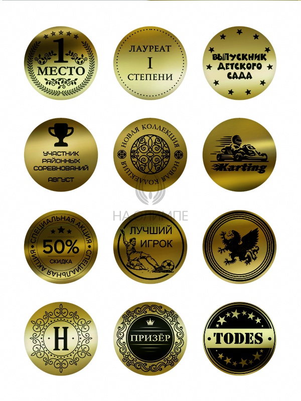 Вкладыш, выполненный из золотистой зеркальной пленки на самоклеящейся основе. С вашим нанесением на заказ, исполненным в черном цвете.