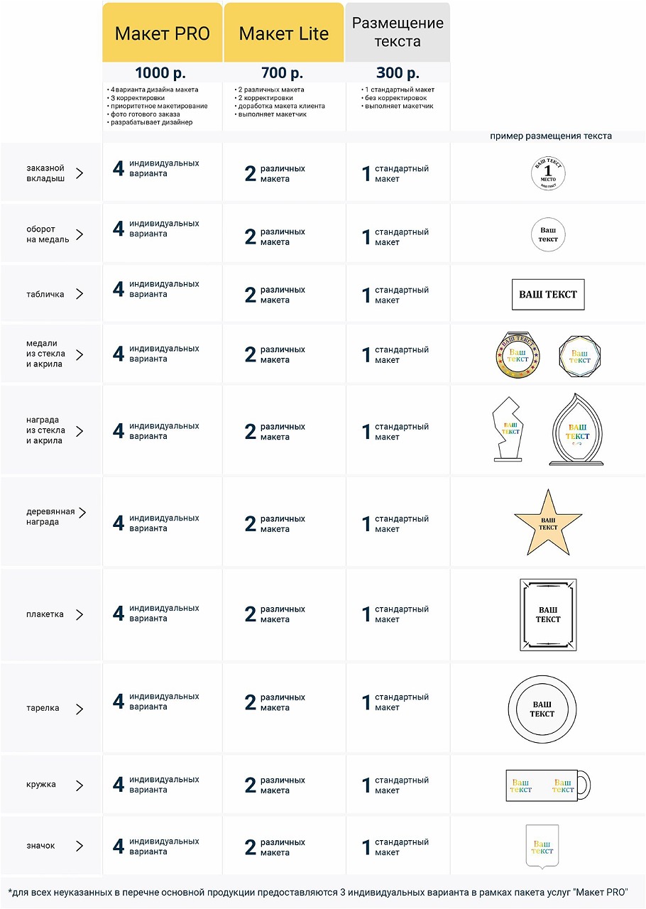 Дополнительно мы можем разработать для вас индивидуальный макет по вашим пожеланиям. Дизайнеры предложат вам от 1 до 4 вариантов дизайнов. Далее вы можете корректировать их: менять шрифты, цвет, расположение текстов, заменять изображения, добавлять декор – все пожелания в свободной форме отправляются нашим дизайнерам на электронную почту в ответном письме. Это наиболее удобная форма взаимодействия для согласования макета. Стоимость услуги персональной разработки макета – всего 1 000 руб!