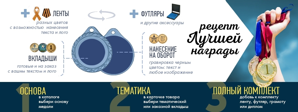 На нашем сайте представлены медали с самыми разными рисунками - на любой вкус! Выбирайте модели с классическими лавровыми ветвями или с геометрическим рисунком, c цветной заливкой или с глубоким рельефом.