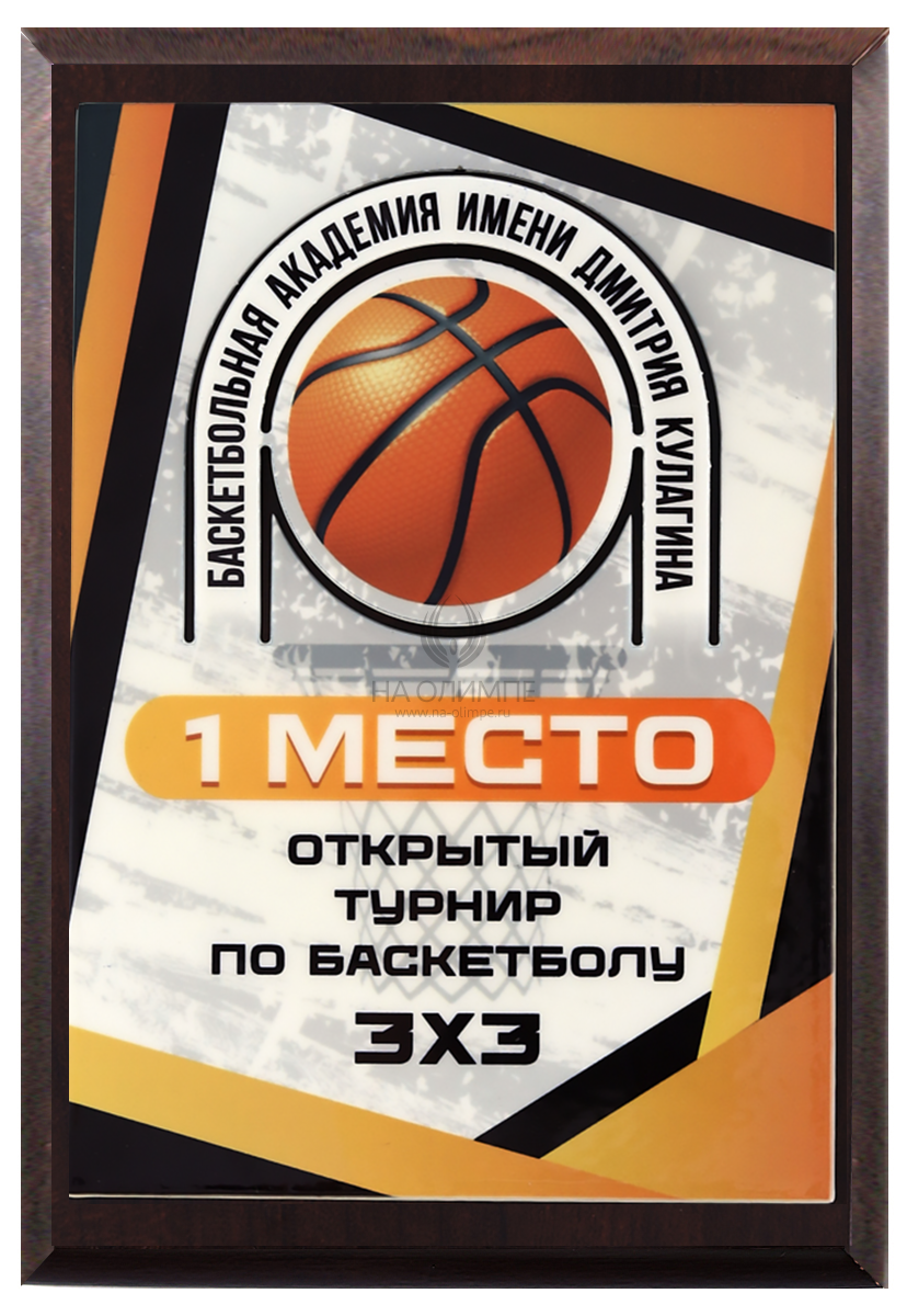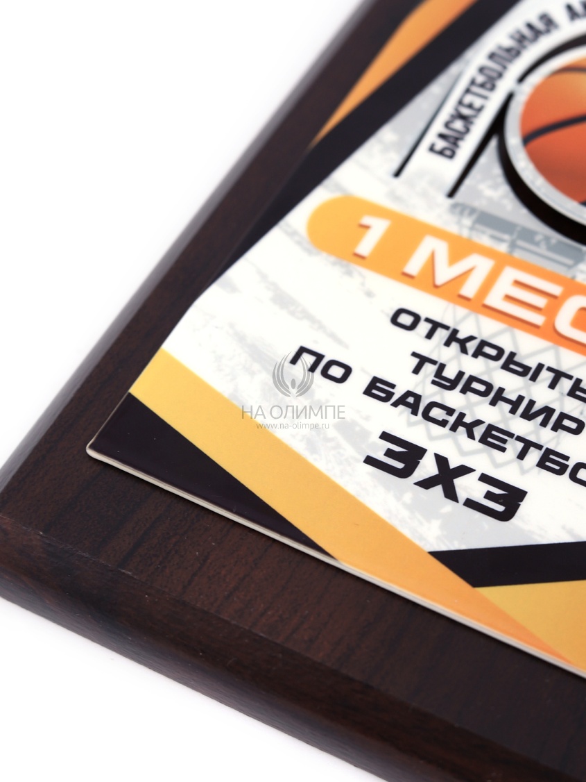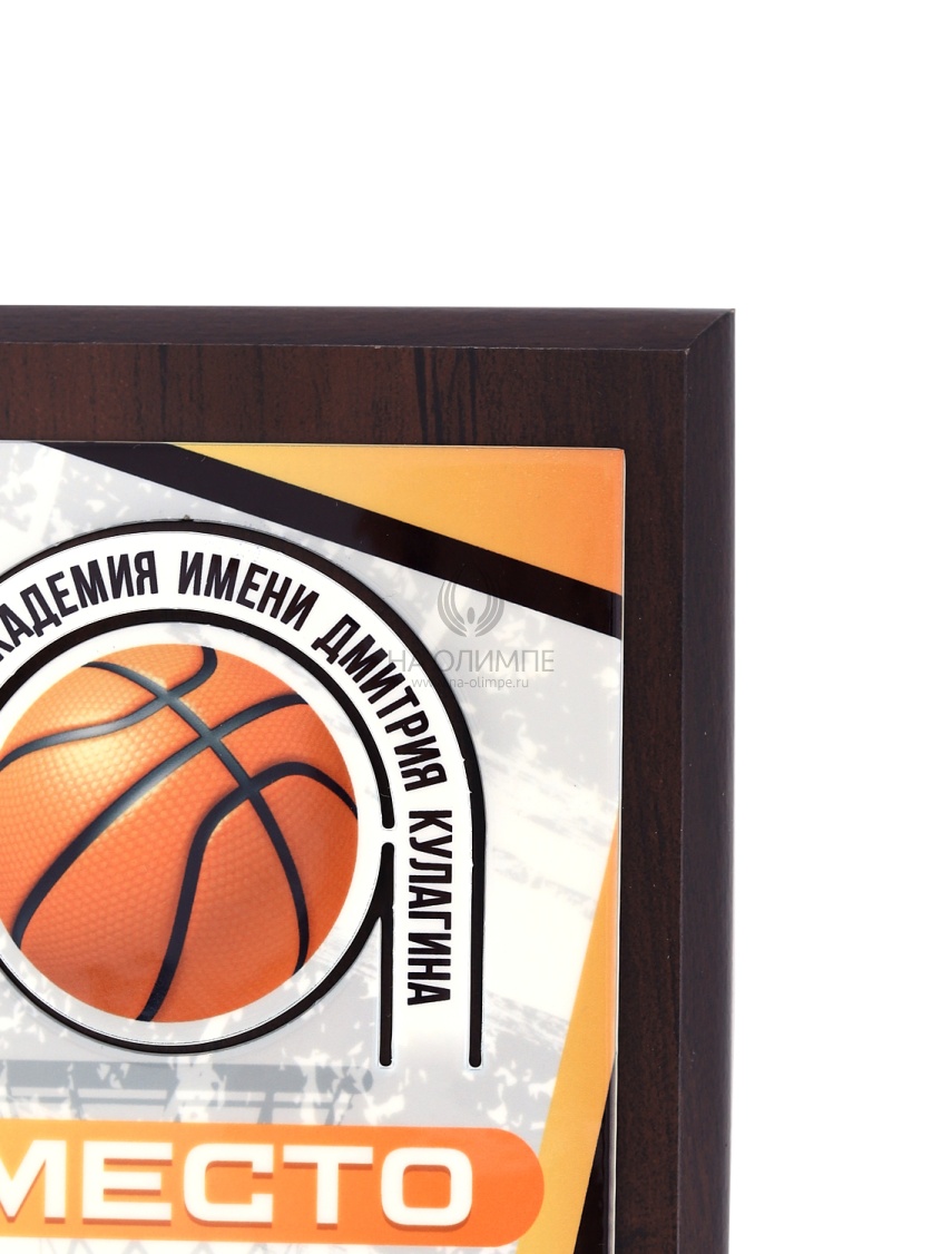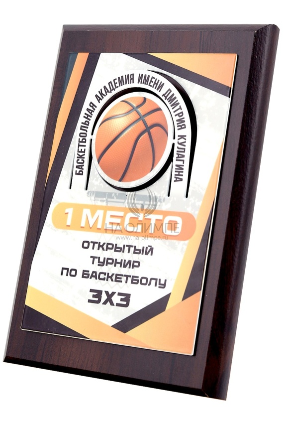 Деревянная плакетка H150 c фигурной объемной накладкой Баскетбол, размеры 113х150 мм