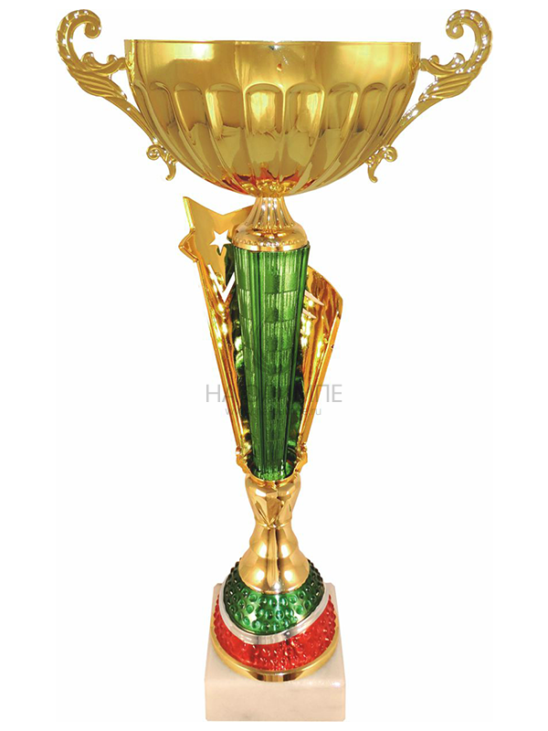 Кубок с металлической чашей и пластиковыми элементами на основании из мрамора.