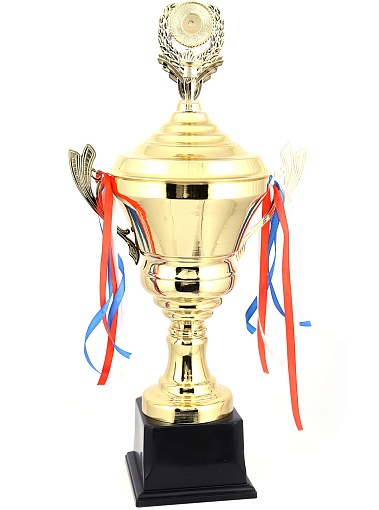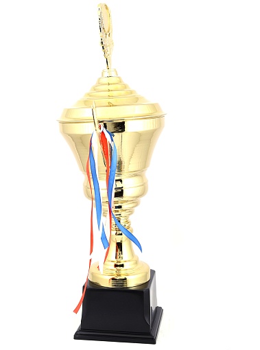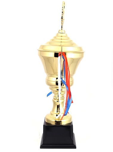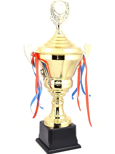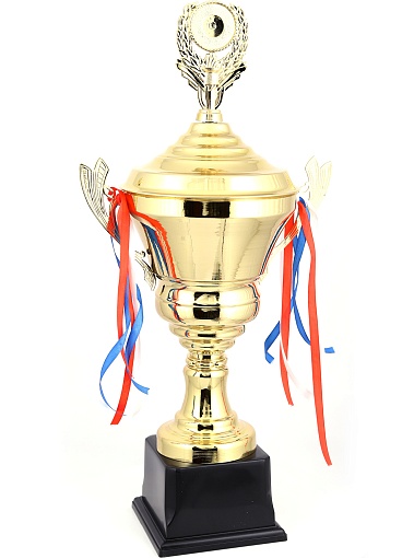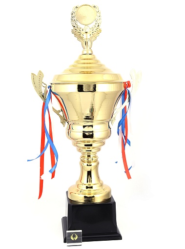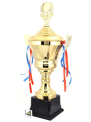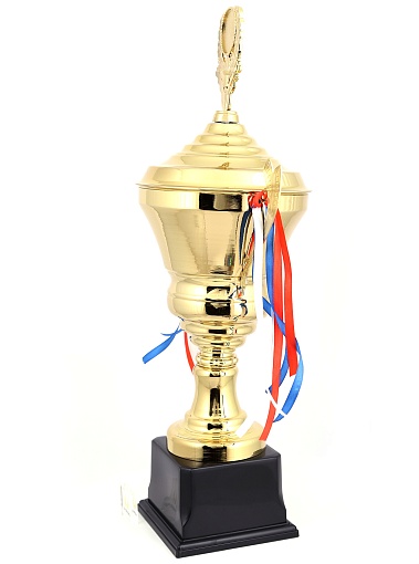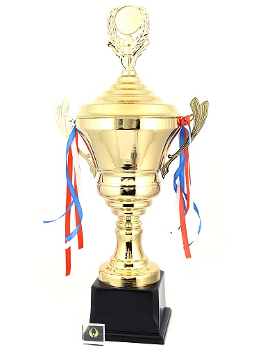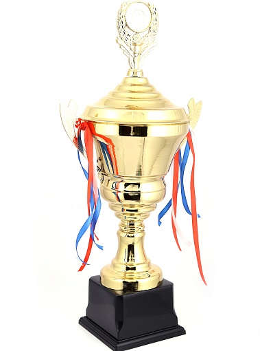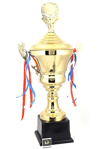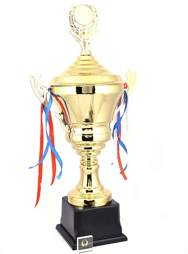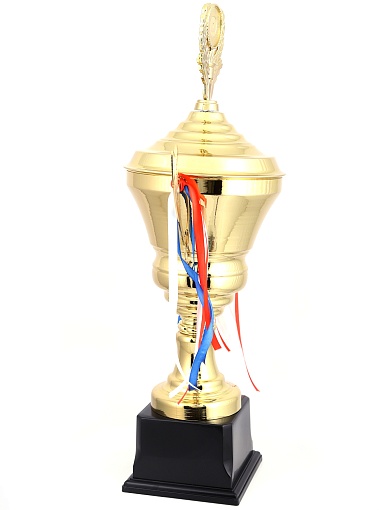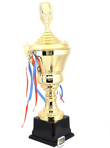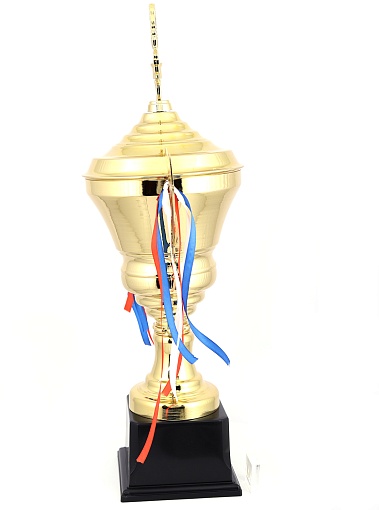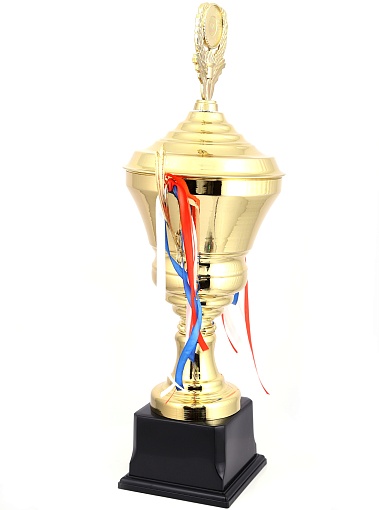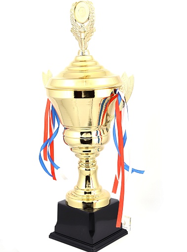 Кубок с металлической чашей, ножкой и крышкой на пластиковом постаменте. Ленточки из полиэстера украшают ручки кубка, но при необходимости их легко можно снять.