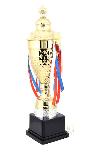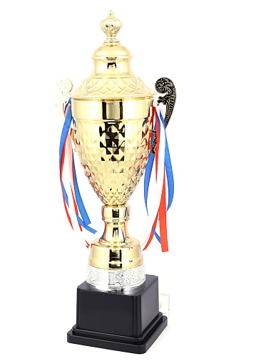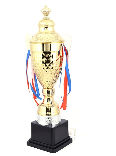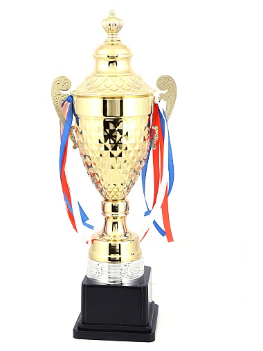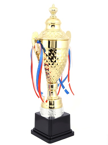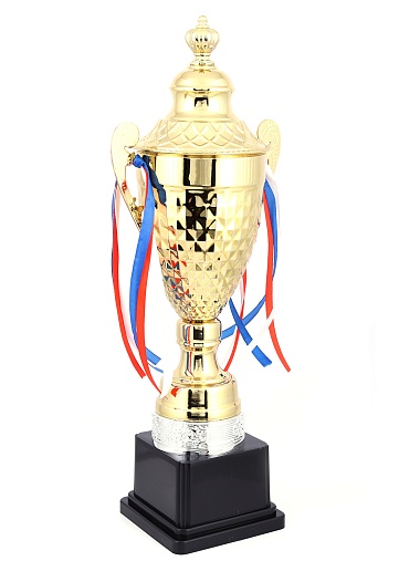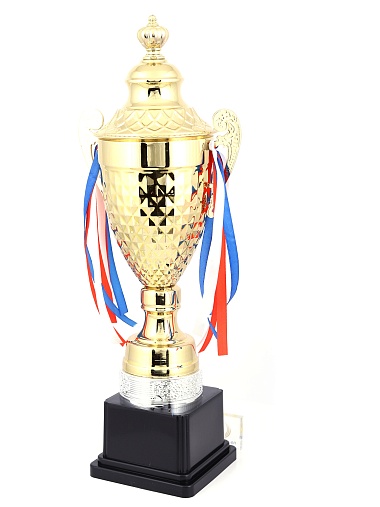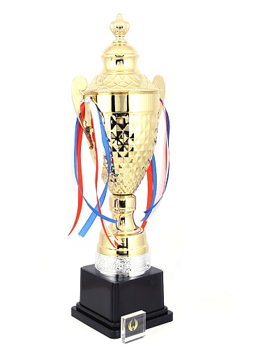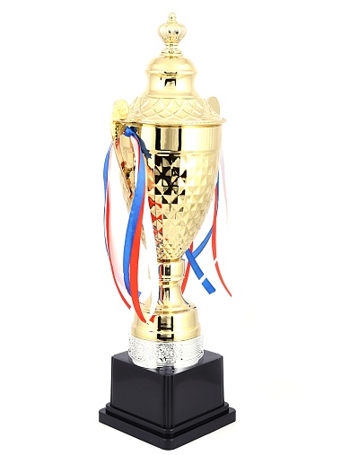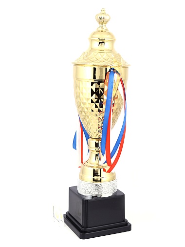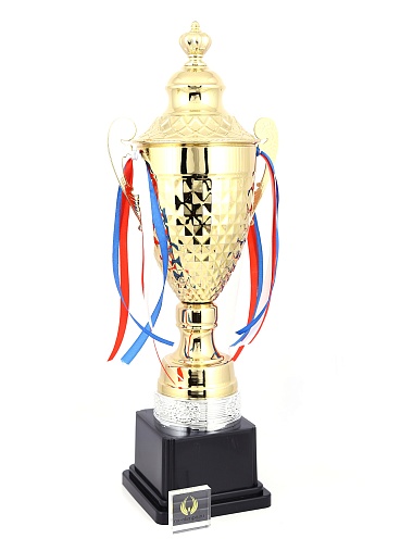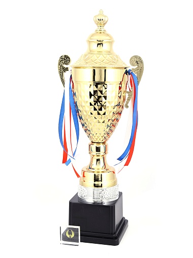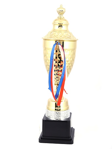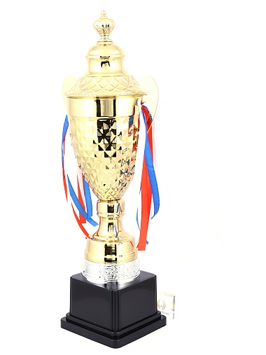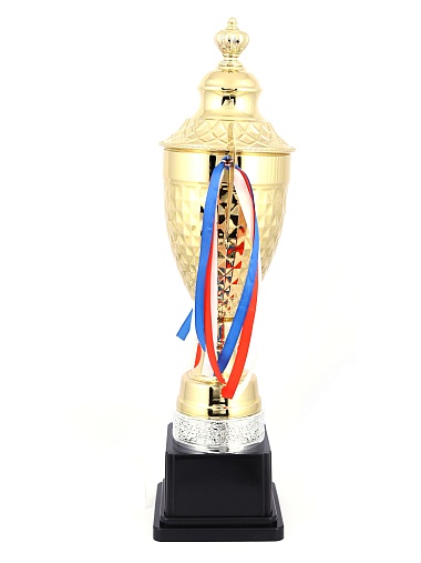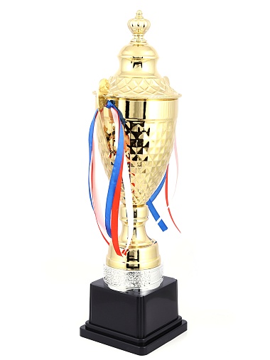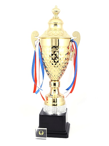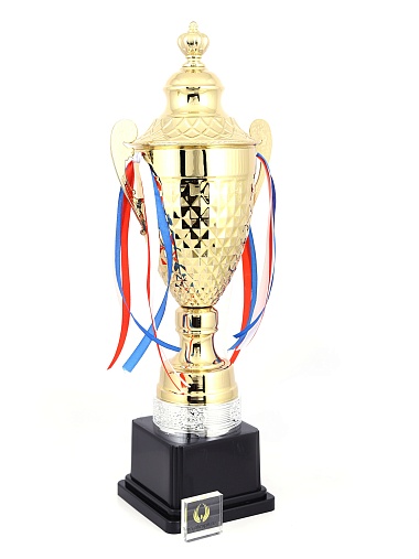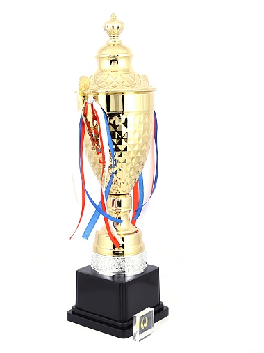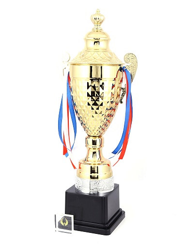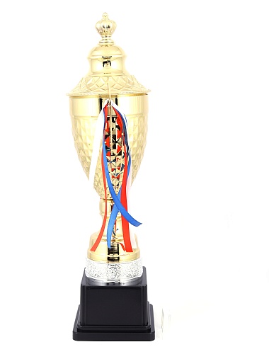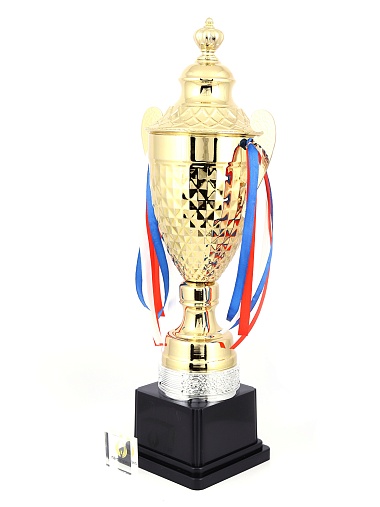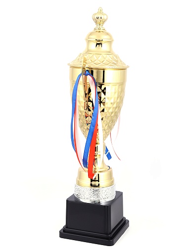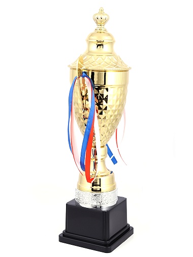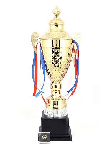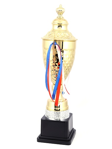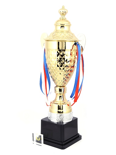 Кубок с металлической чашей, ножкой и крышкой на пластиковом постаменте. Ленточки из полиэстера украшают ручки кубка, но при необходимости их легко можно снять.