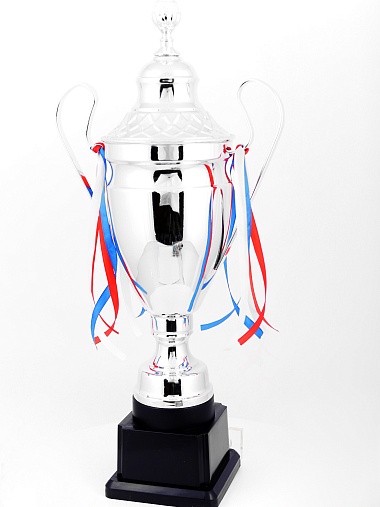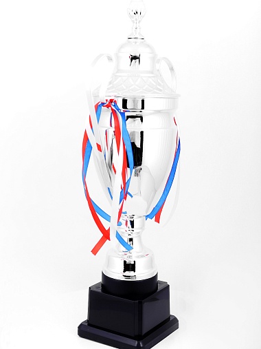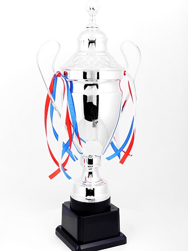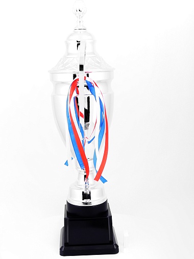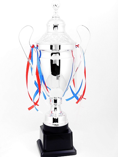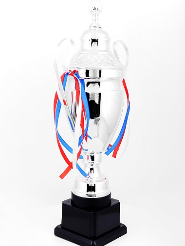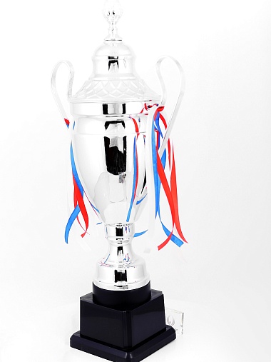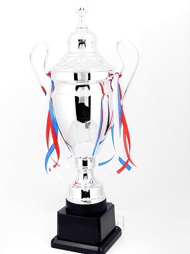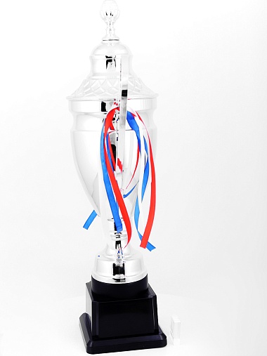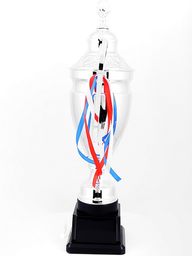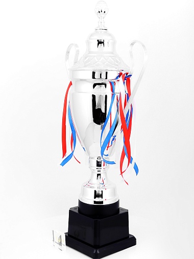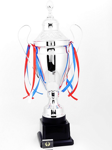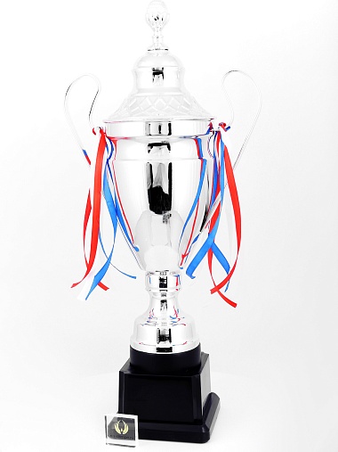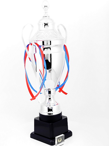 Кубок с металлической чашей, ножкой и крышкой на пластиковом постаменте. Ленточки из полиэстера украшают ручки кубка, но при необходимости их легко можно снять.