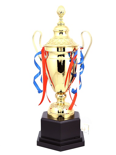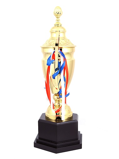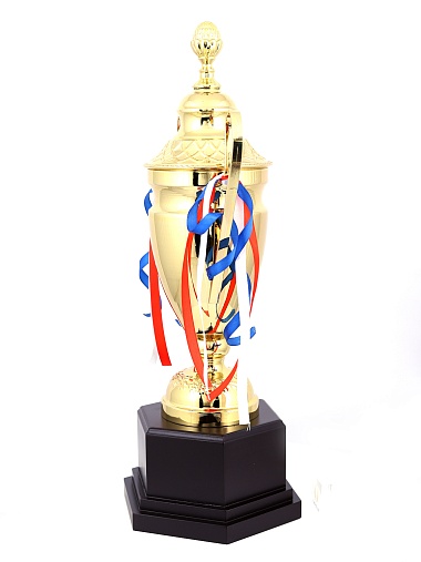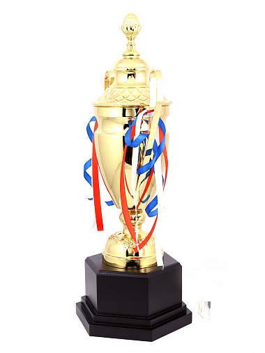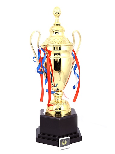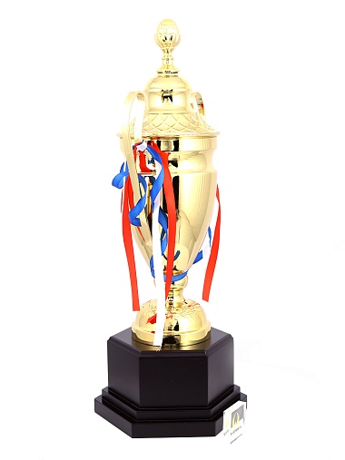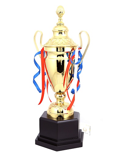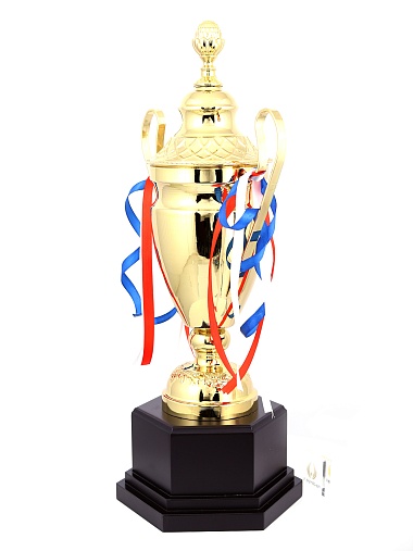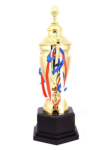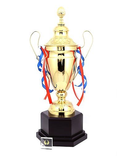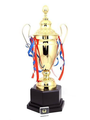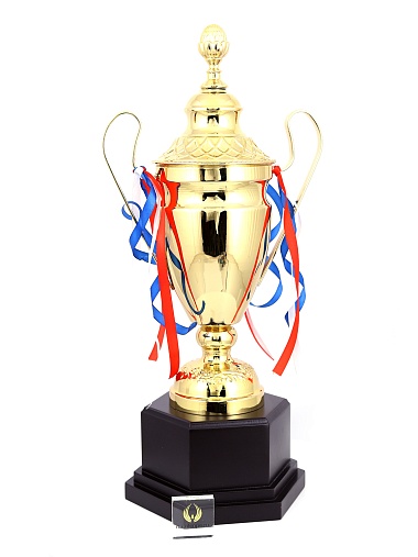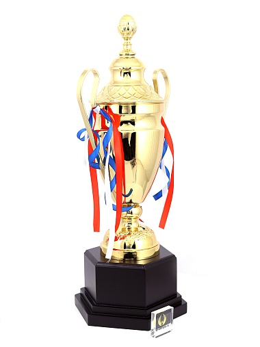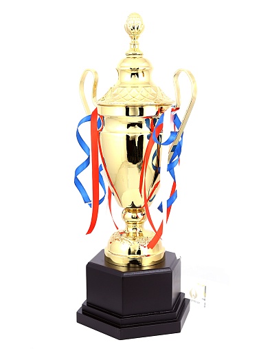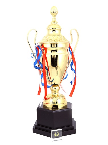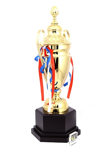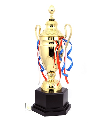 Кубок с металлической чашей, ножкой и крышкой на пластиковом постаменте. Ленточки из полиэстера украшают ручки кубка, но при необходимости их легко можно снять.