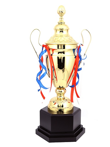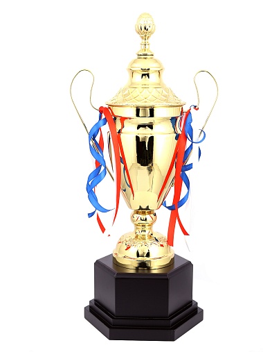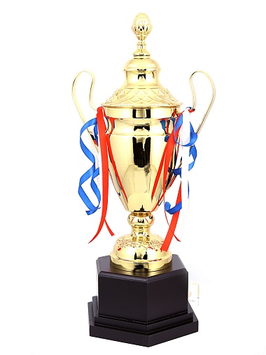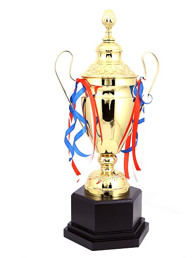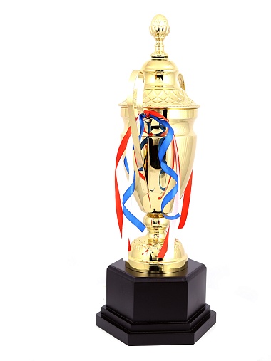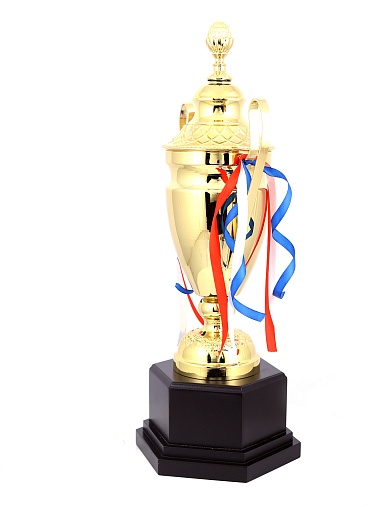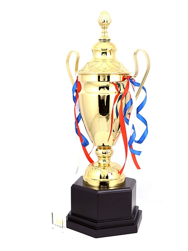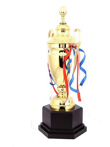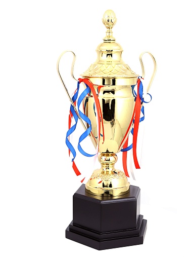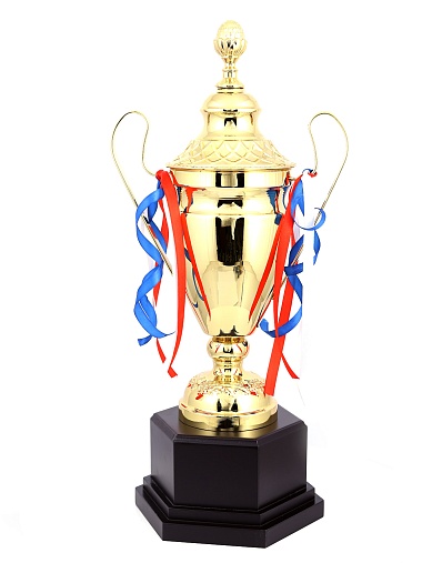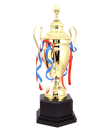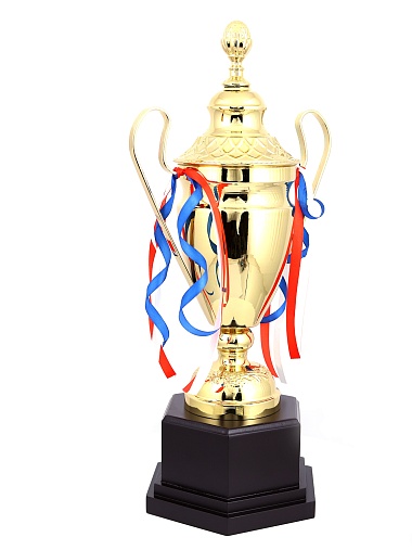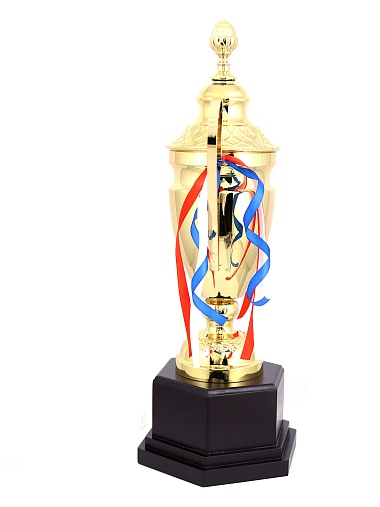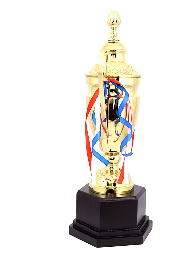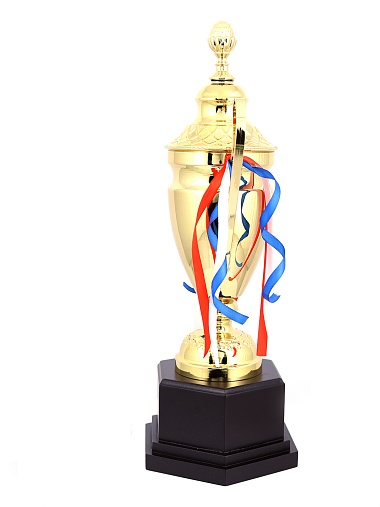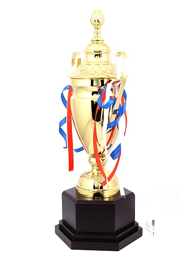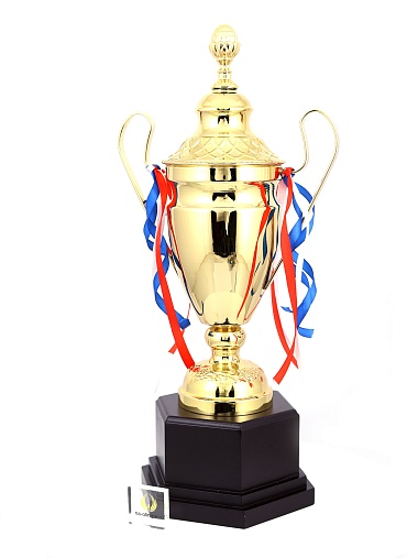 Кубок с металлической чашей, ножкой и крышкой на пластиковом постаменте. Ленточки из полиэстера украшают ручки кубка, но при необходимости их легко можно снять.