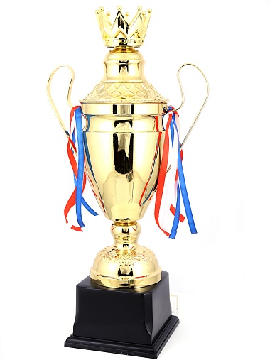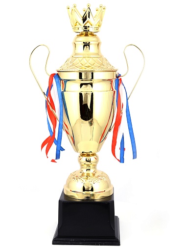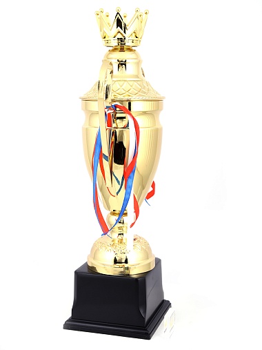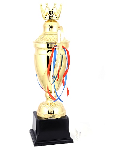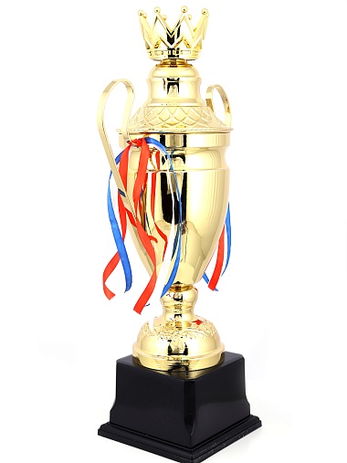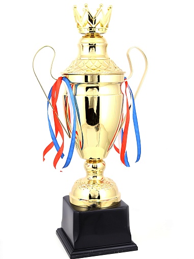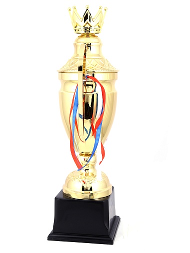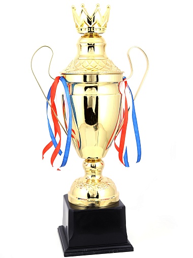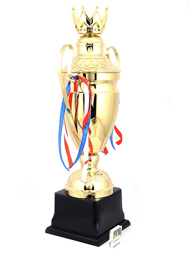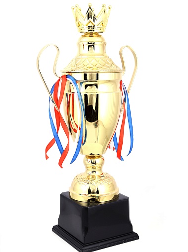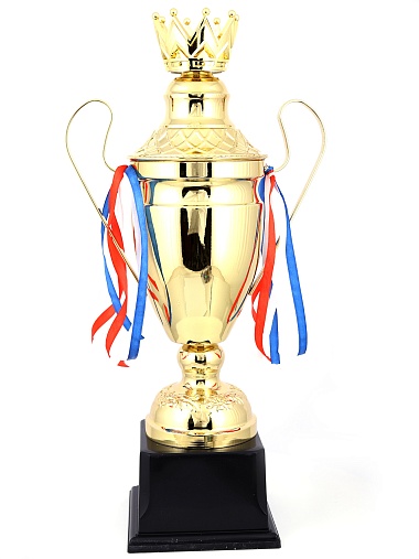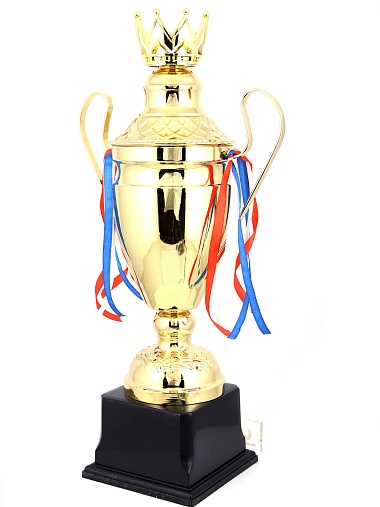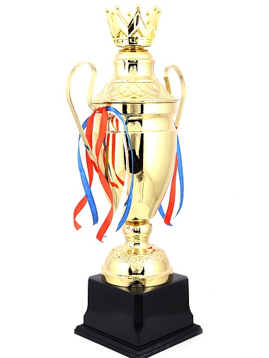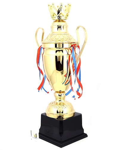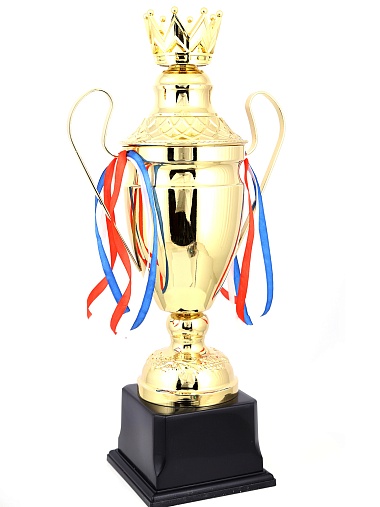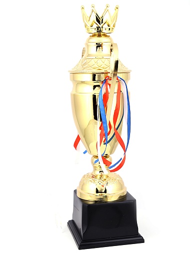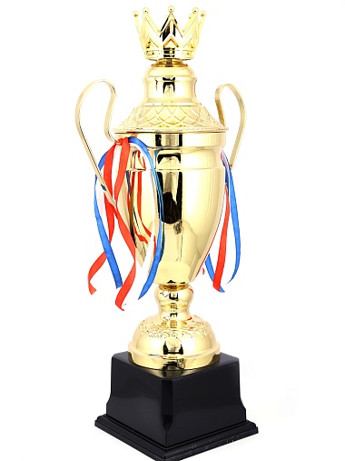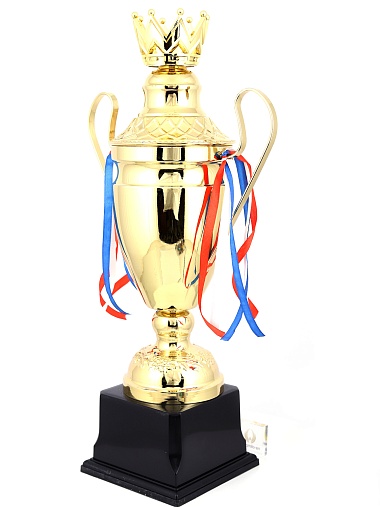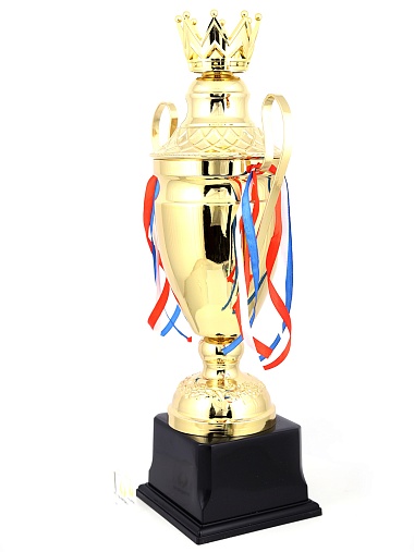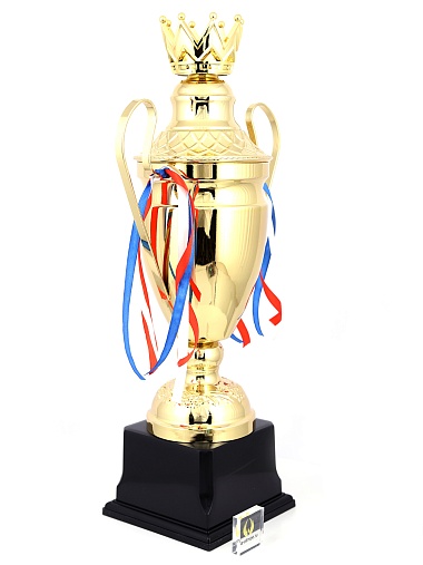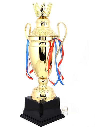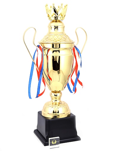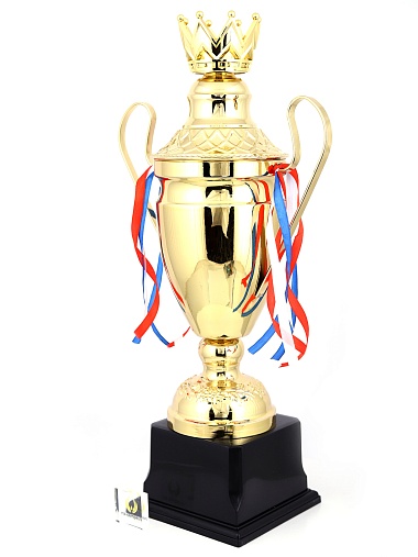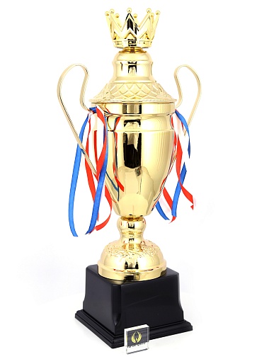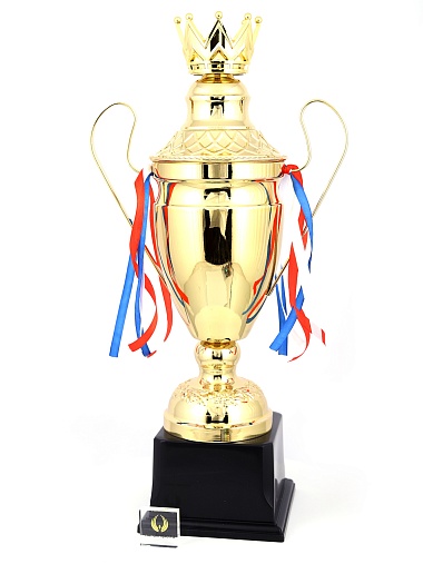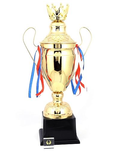 Кубок с металлической чашей, ножкой и крышкой на пластиковом постаменте. Ленточки из полиэстера украшают ручки кубка, но при необходимости их легко можно снять.
