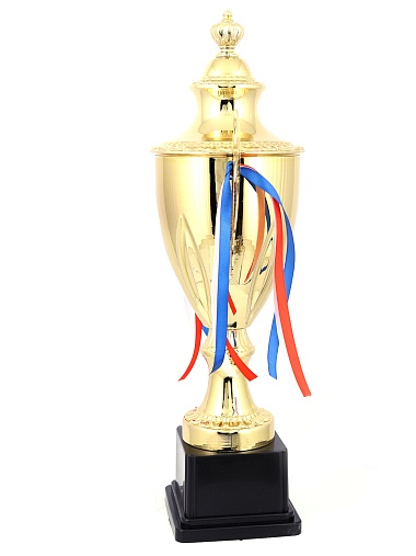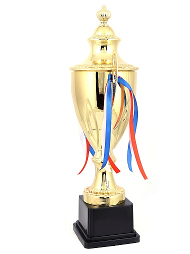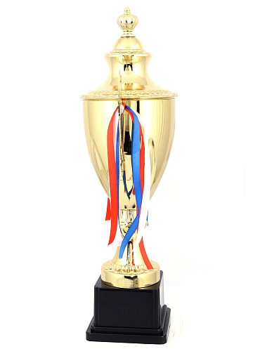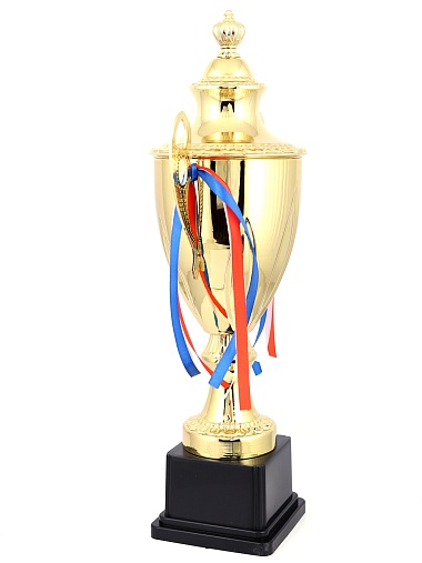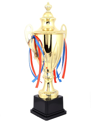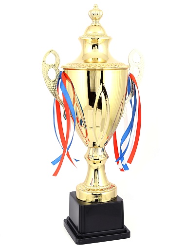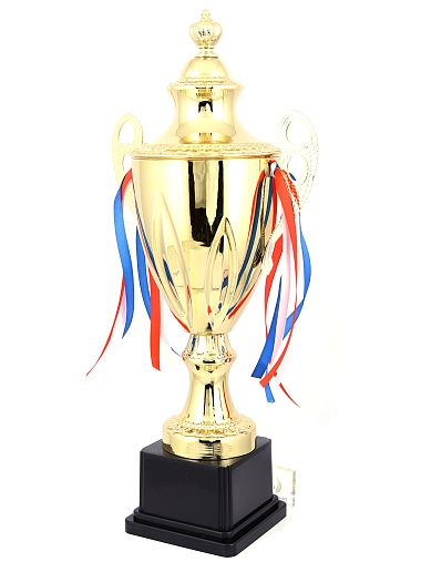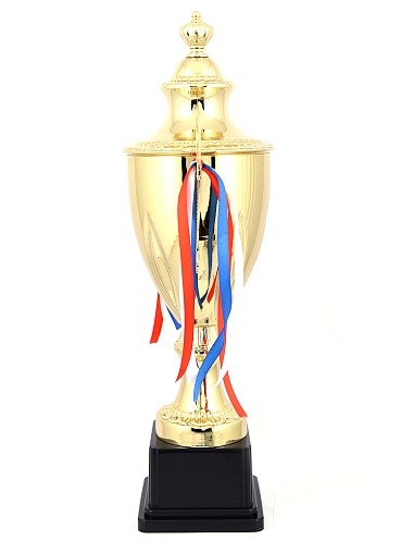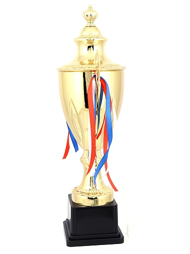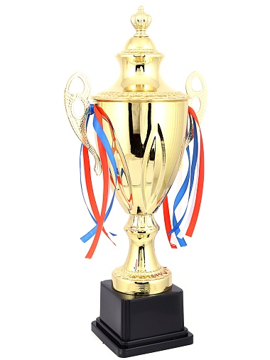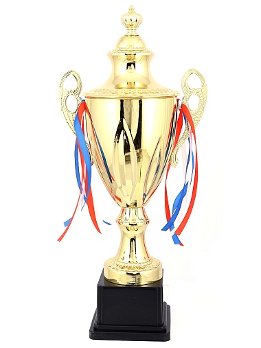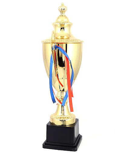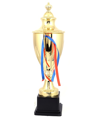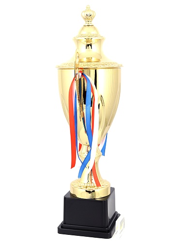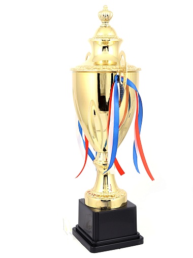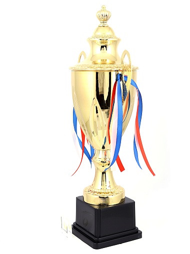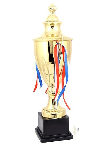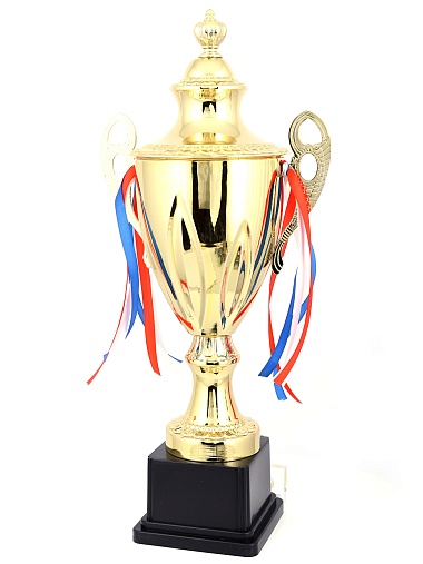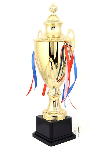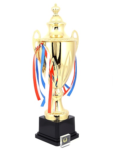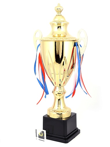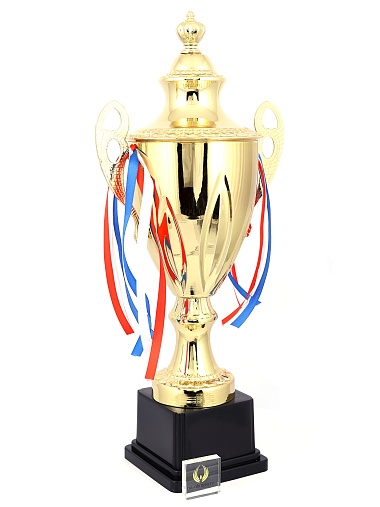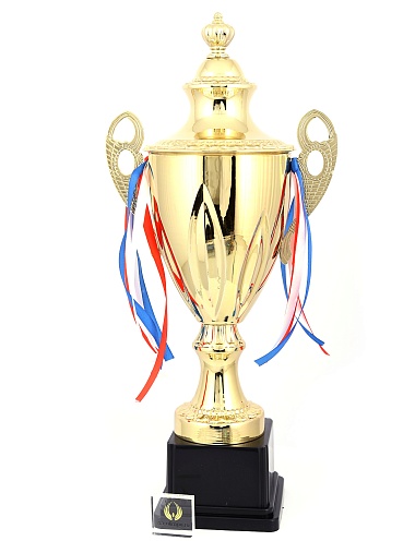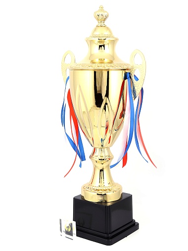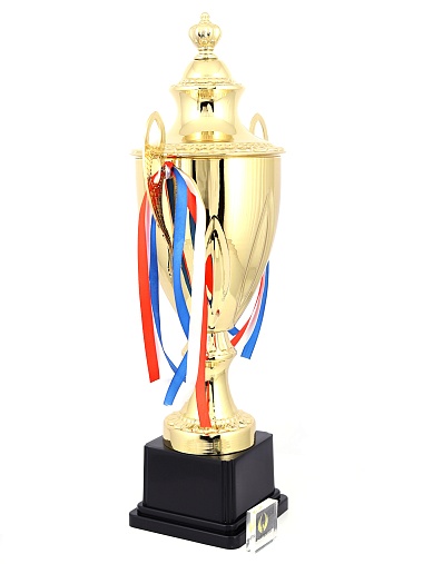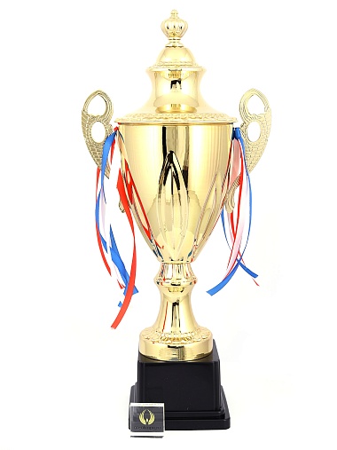 Кубок с металлической чашей, ножкой и крышкой на пластиковом постаменте. Ленточки из полиэстера украшают ручки кубка, но при необходимости их легко можно снять.