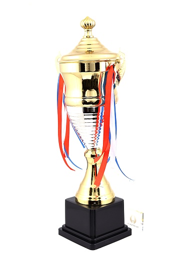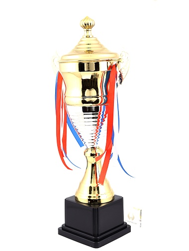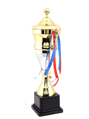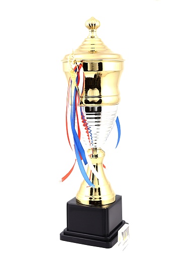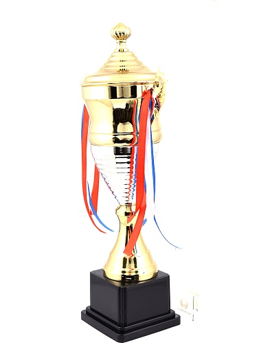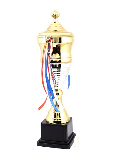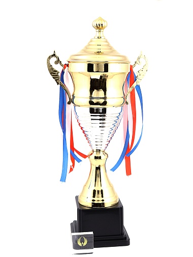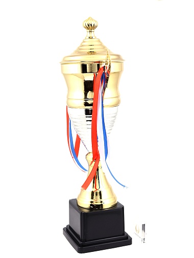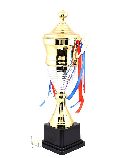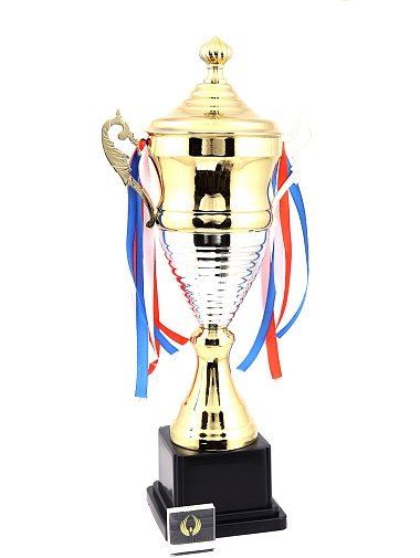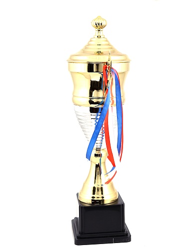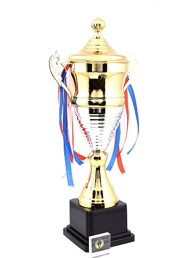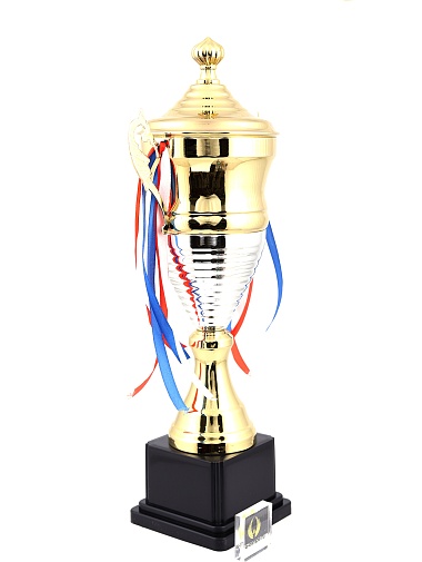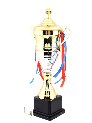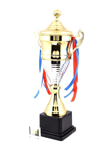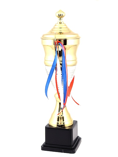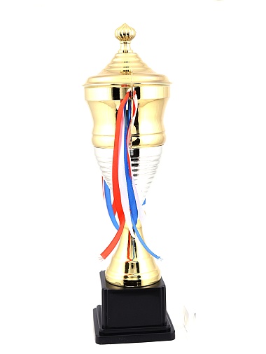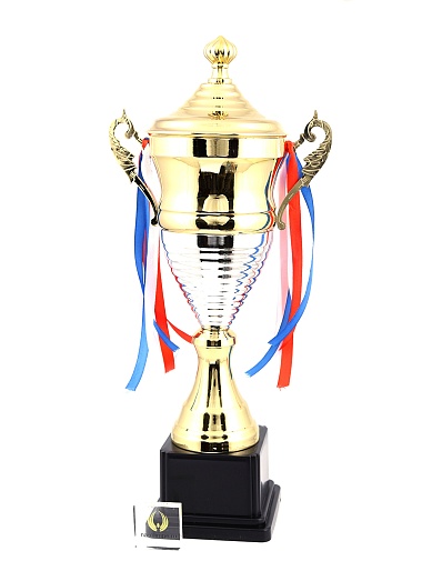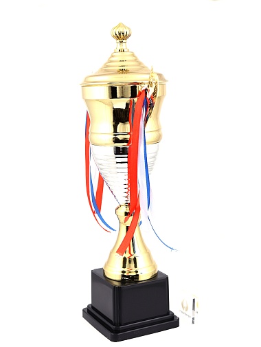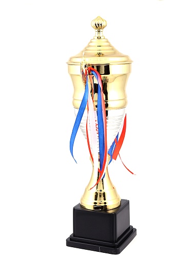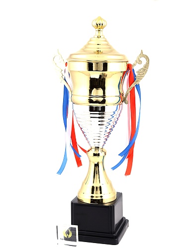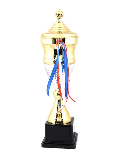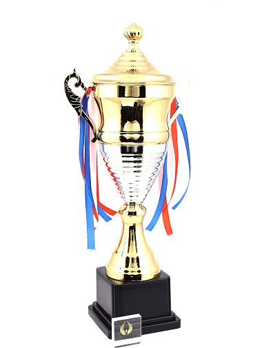 Кубок с металлической чашей, ножкой и крышкой на пластиковом постаменте. Ленточки из полиэстера украшают ручки кубка, но при необходимости их легко можно снять.
