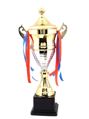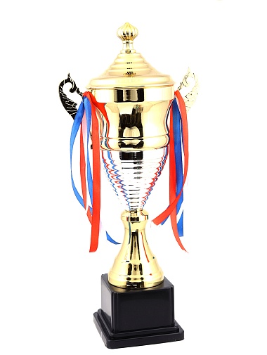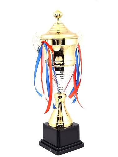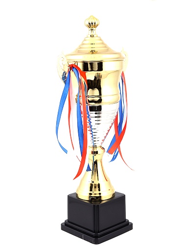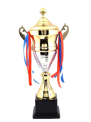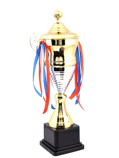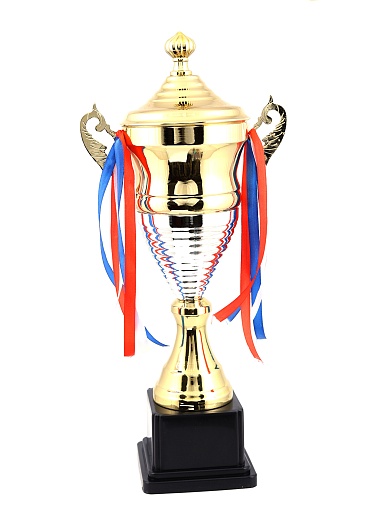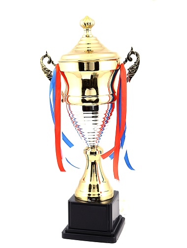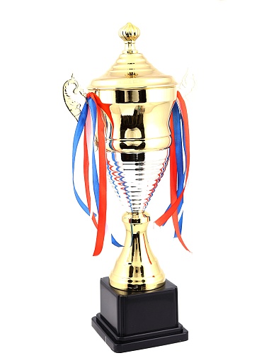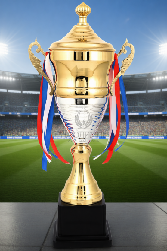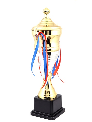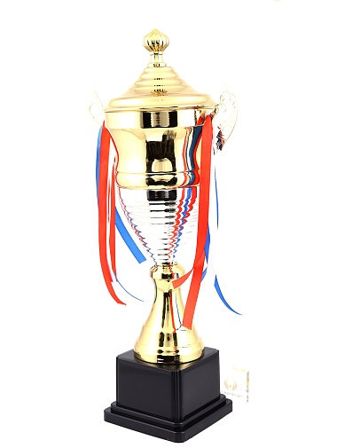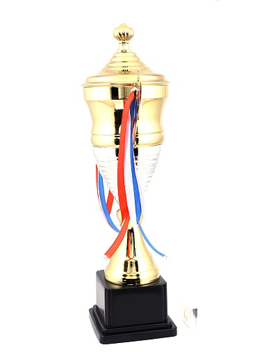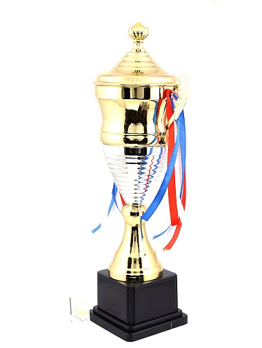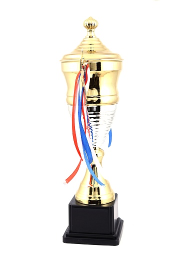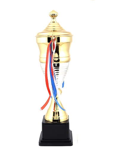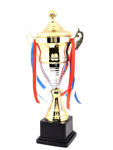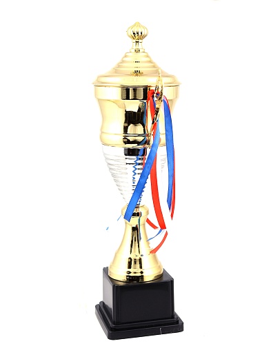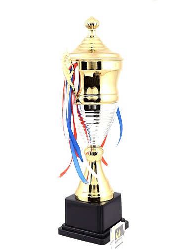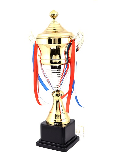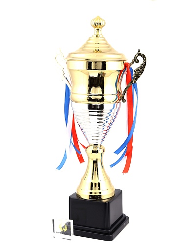 Кубок с металлической чашей, ножкой и крышкой на пластиковом постаменте. Ленточки из полиэстера украшают ручки кубка, но при необходимости их легко можно снять.