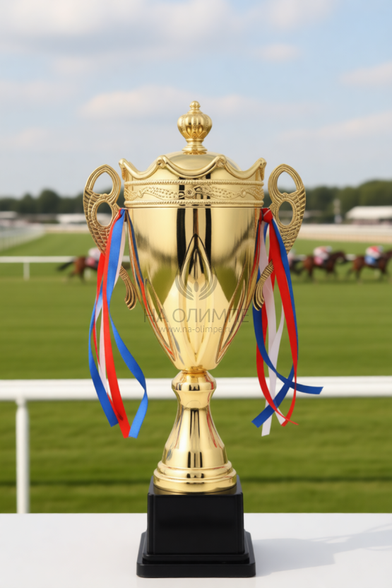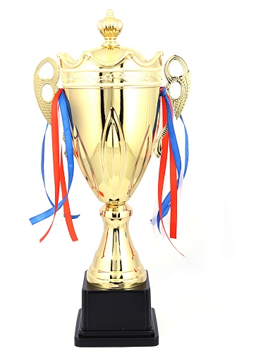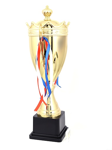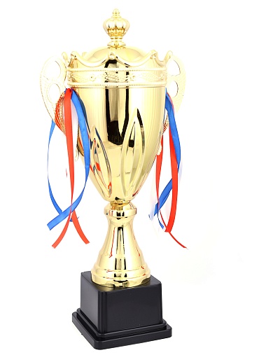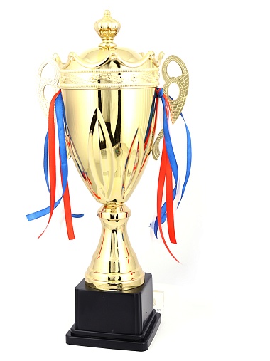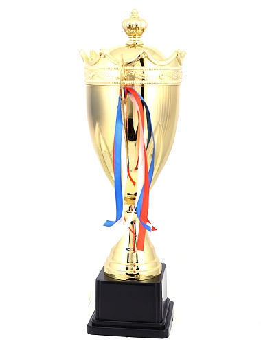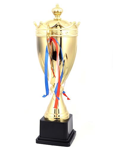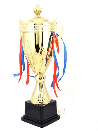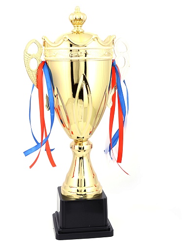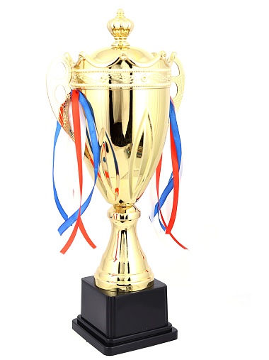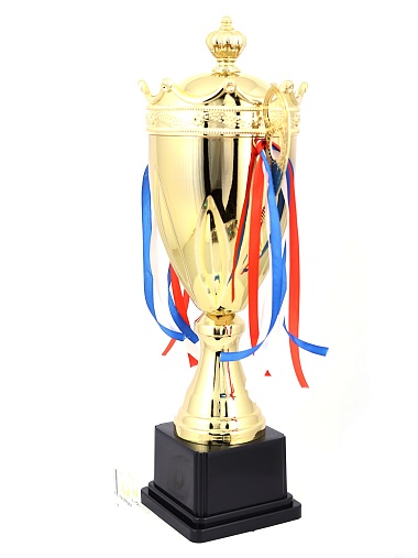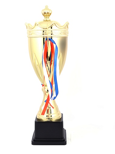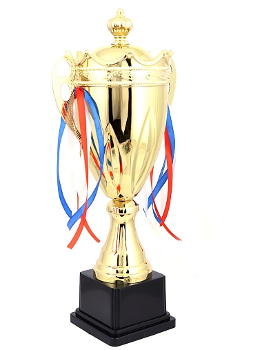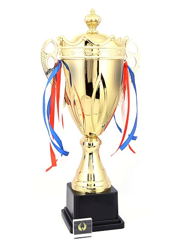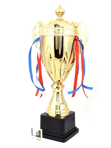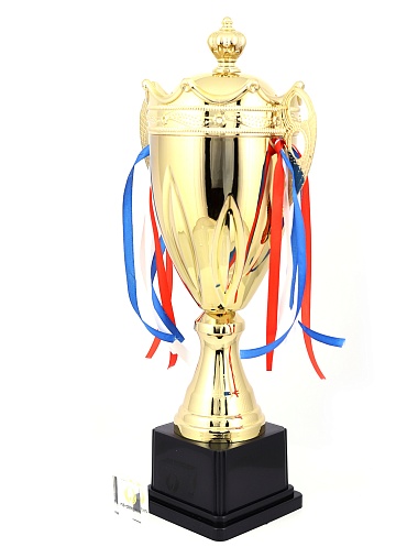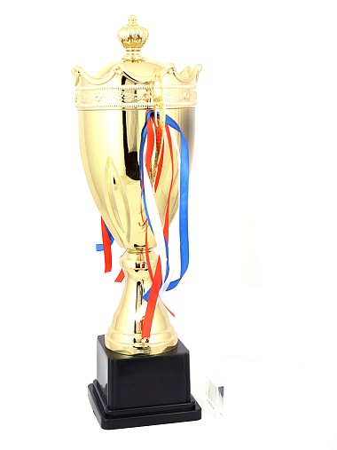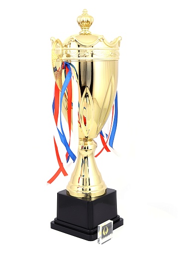 Кубок с металлической чашей и ножкой на пластиковом постаменте. Ленточки из полиэстера украшают ручки кубка, но при необходимости их легко можно снять.