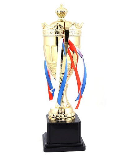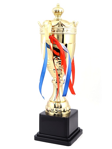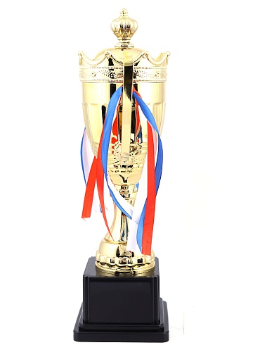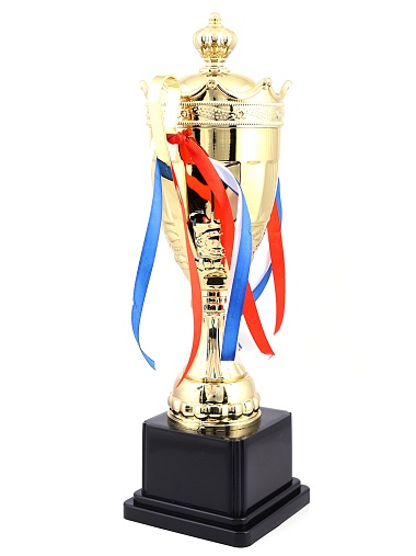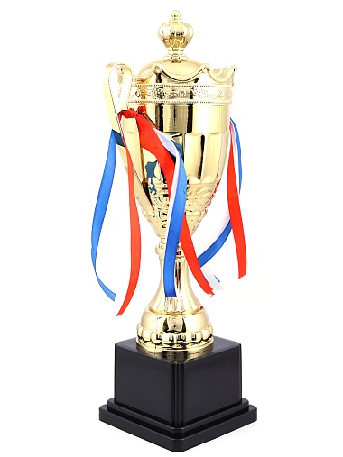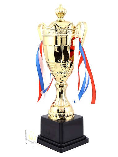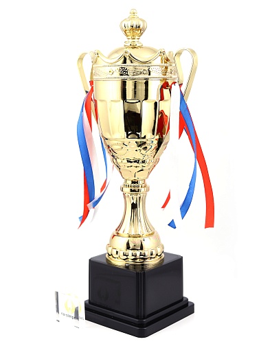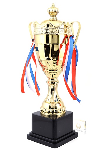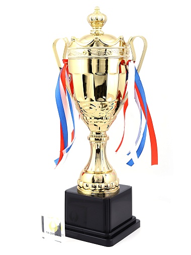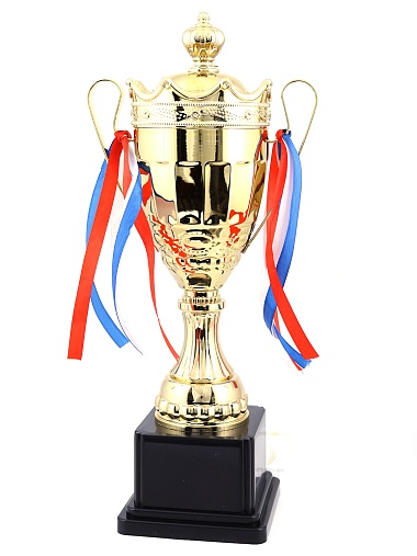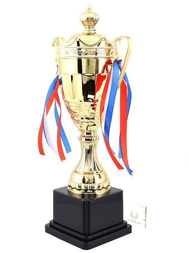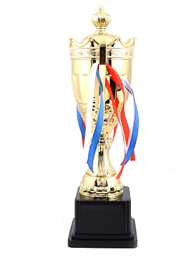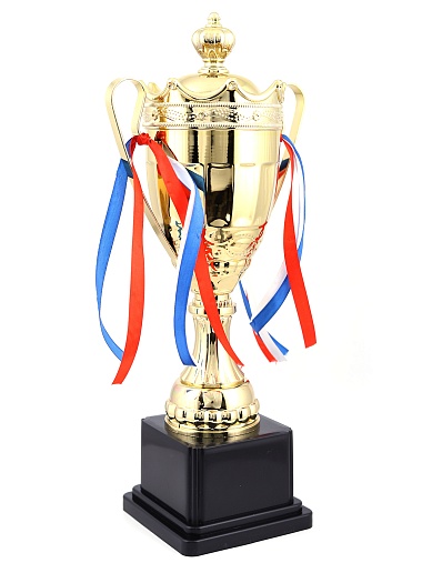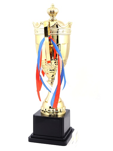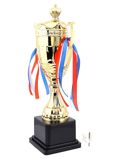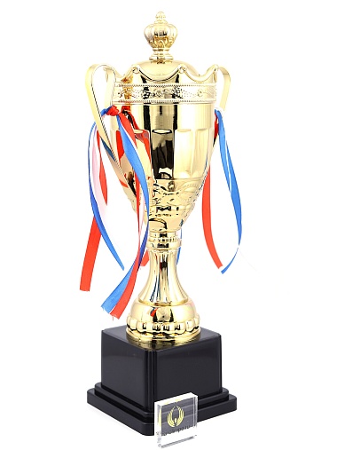 Кубок с металлической чашей на пластиковом постаменте. Ленточки из полиэстера украшают ручки кубка, но при необходимости их легко можно снять.
