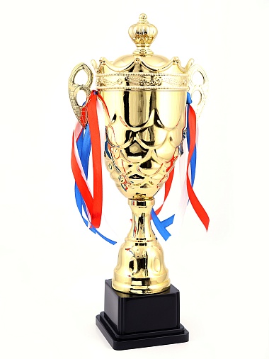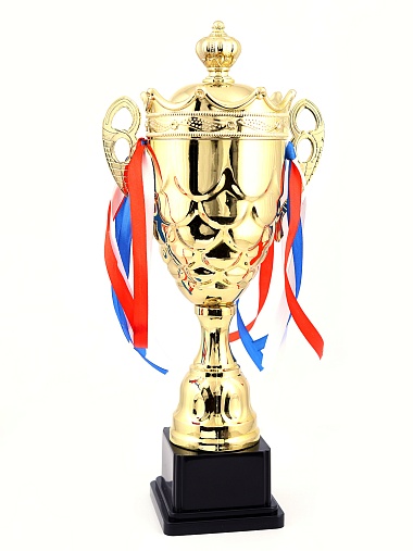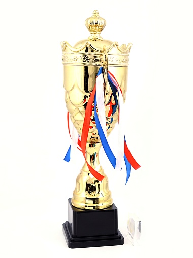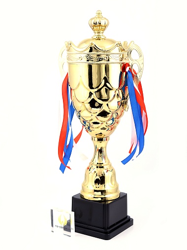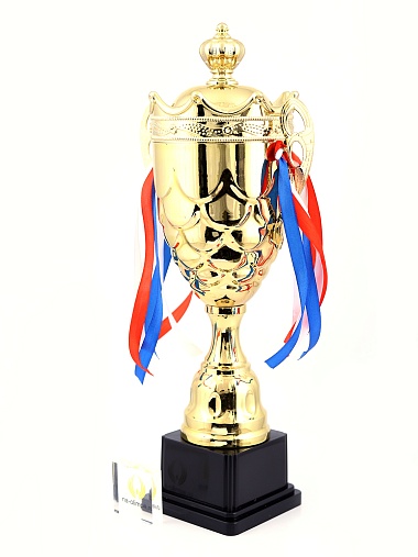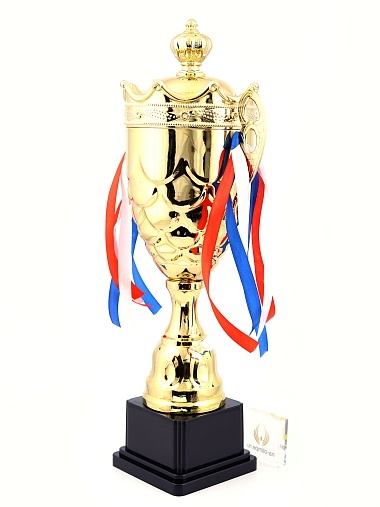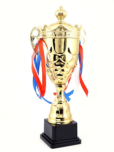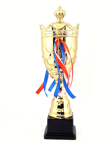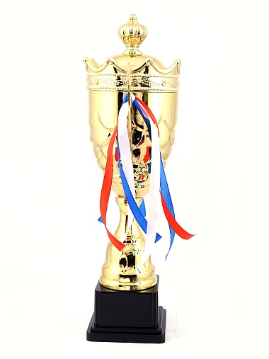 Кубок с металлической чашей на пластиковом постаменте. Ленточки из полиэстера украшают ручки кубка, но при необходимости их легко можно снять.