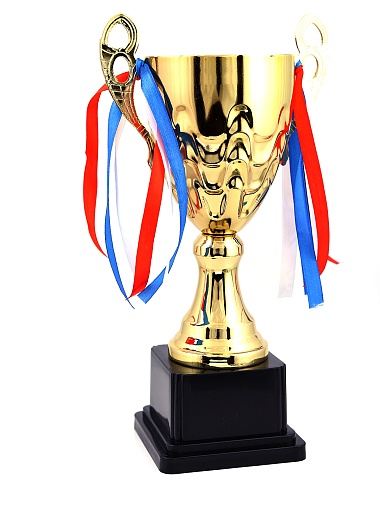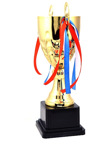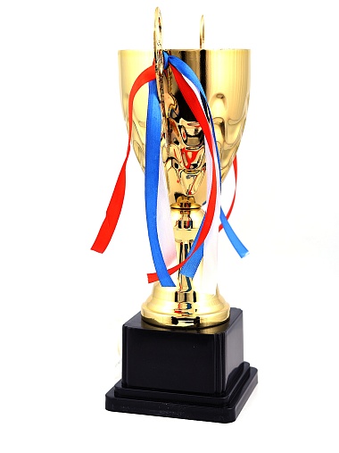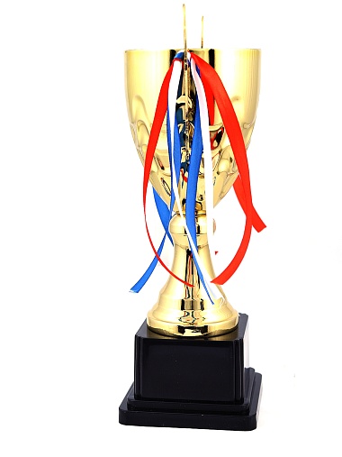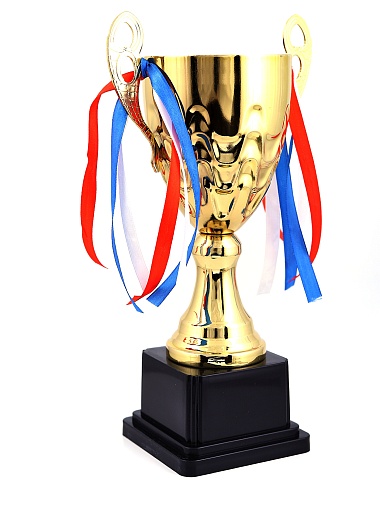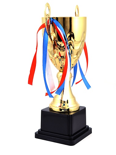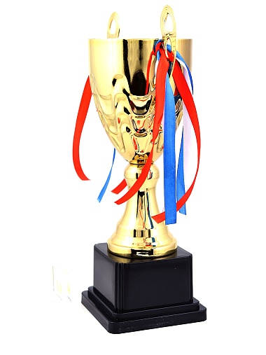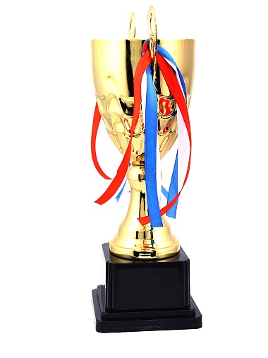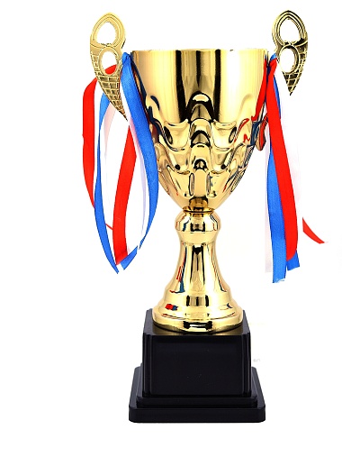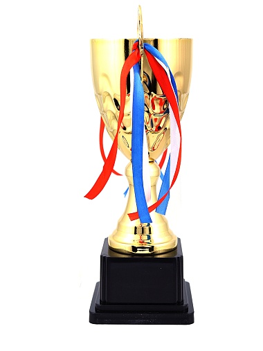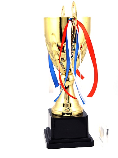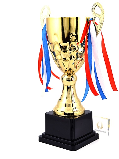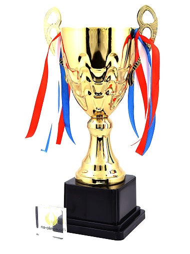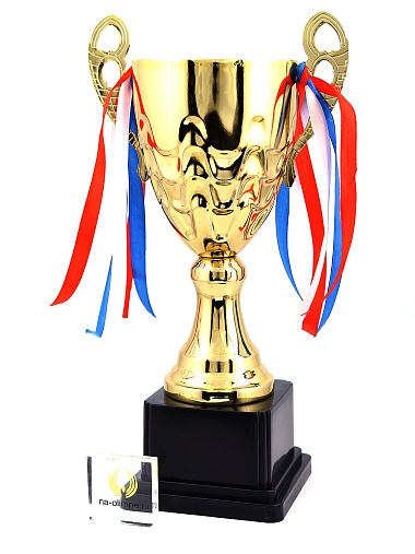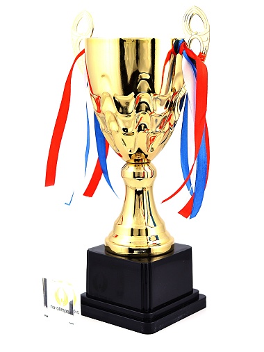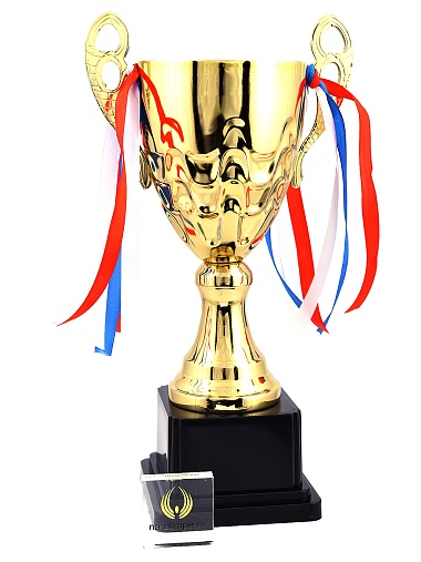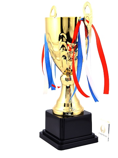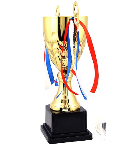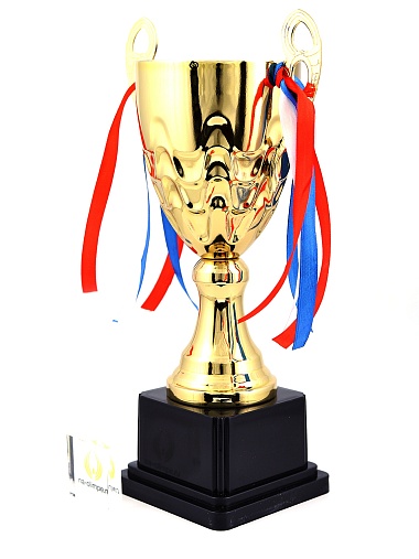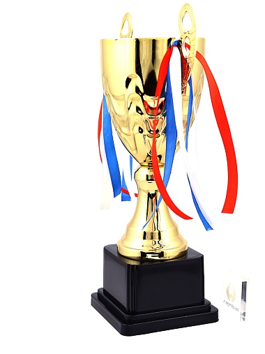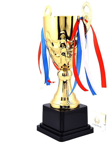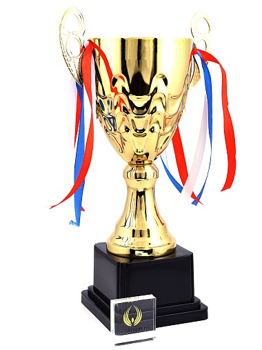 Кубок с металлической чашей, ножкой и крышкой на пластиковом постаменте. Ленточки из полиэстера украшают ручки кубка, но при необходимости их легко можно снять.
