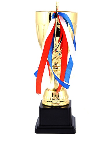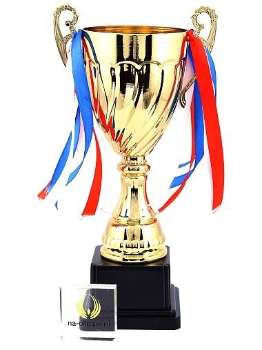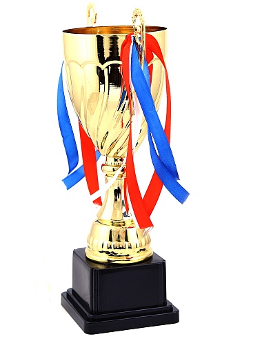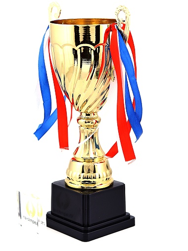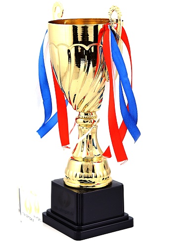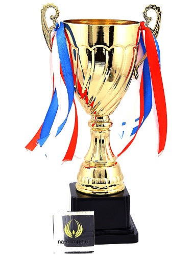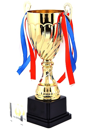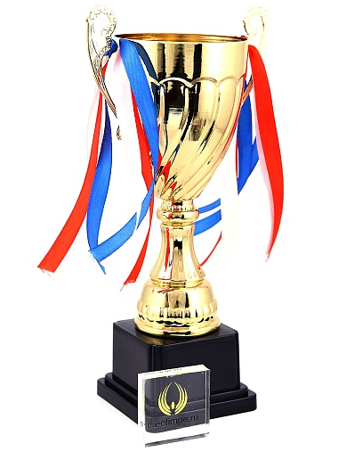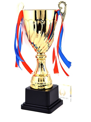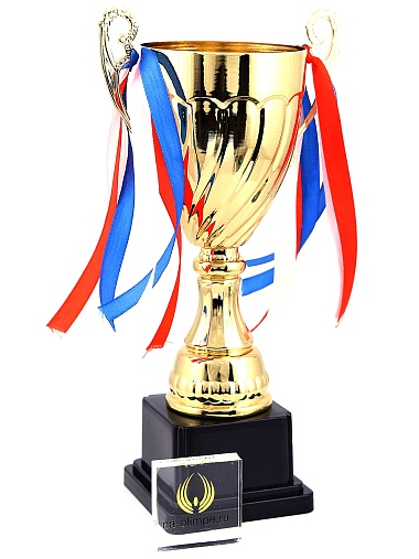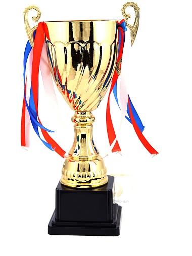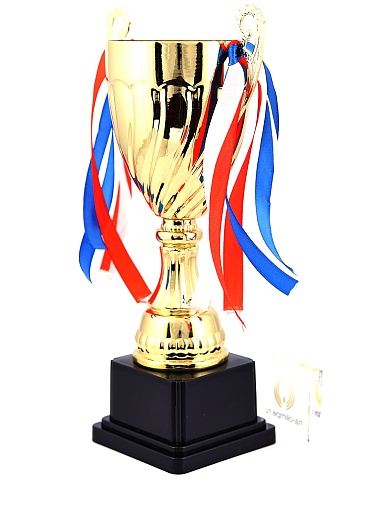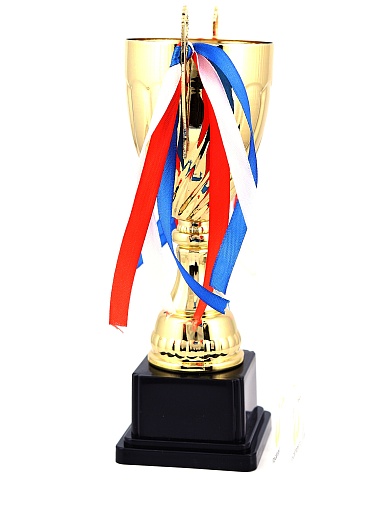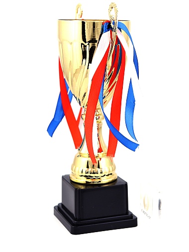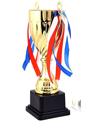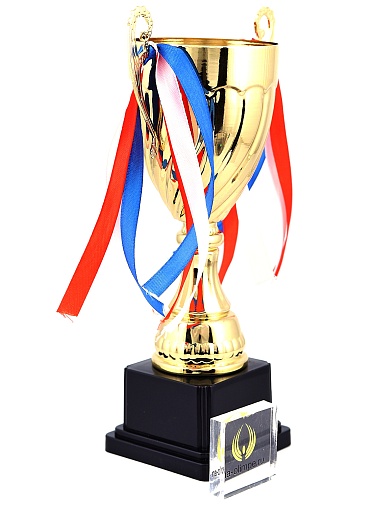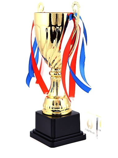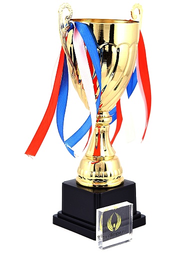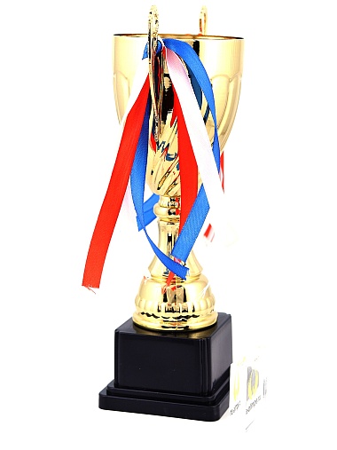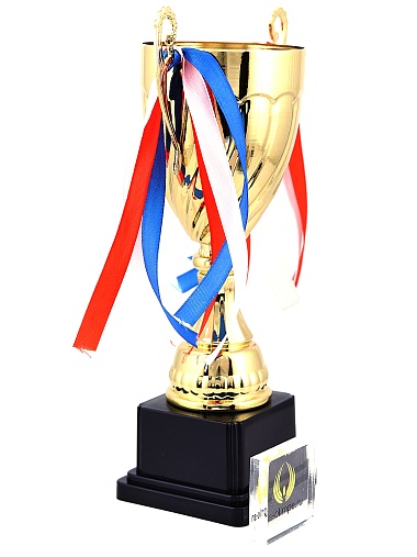 Кубок с металлической чашей на пластиковом постаменте. Ленточки из полиэстера украшают ручки кубка, но при необходимости их легко можно снять.