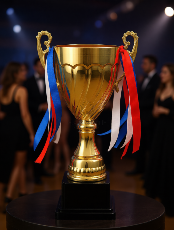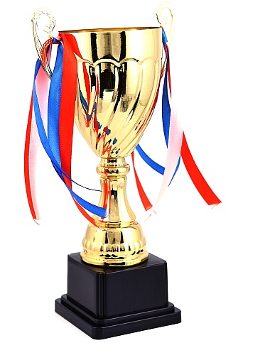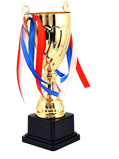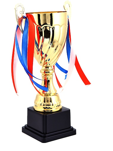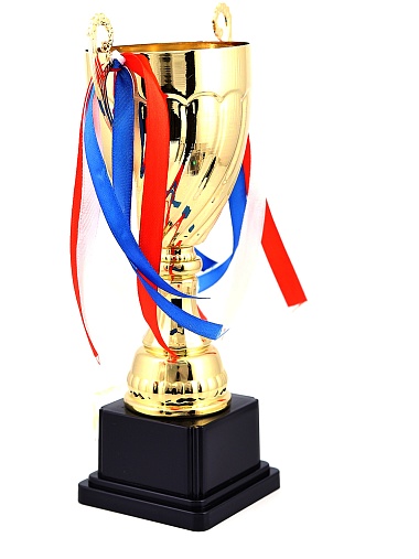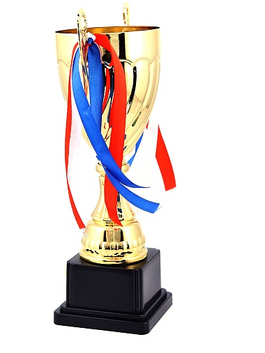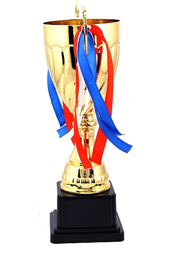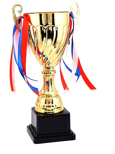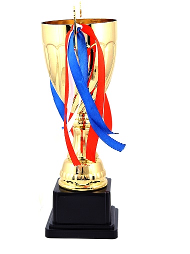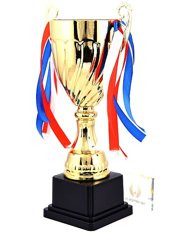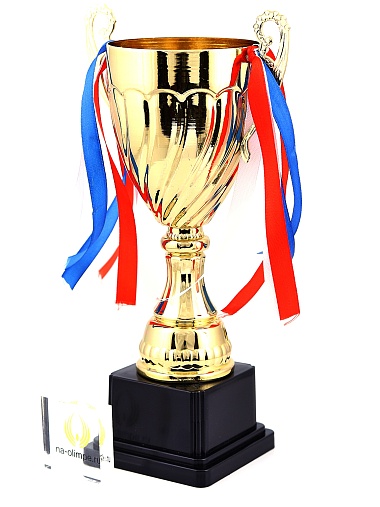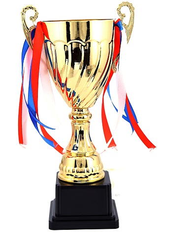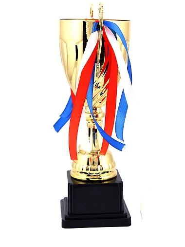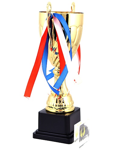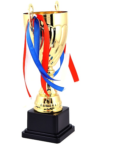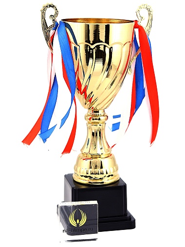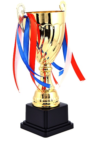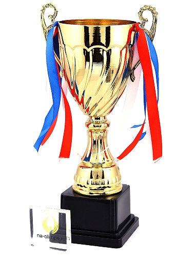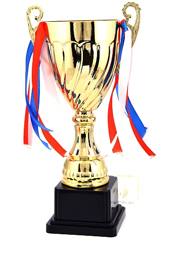 Кубок с металлической чашей на пластиковом постаменте. Ленточки из полиэстера украшают ручки кубка, но при необходимости их легко можно снять.