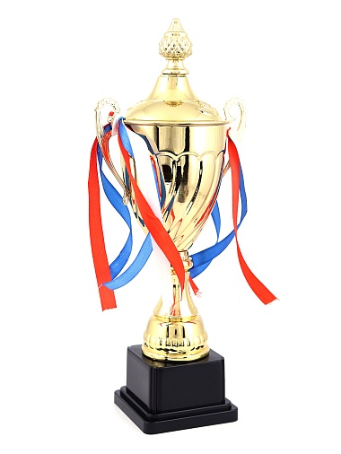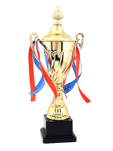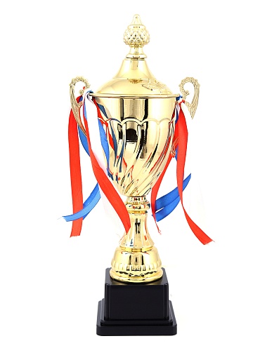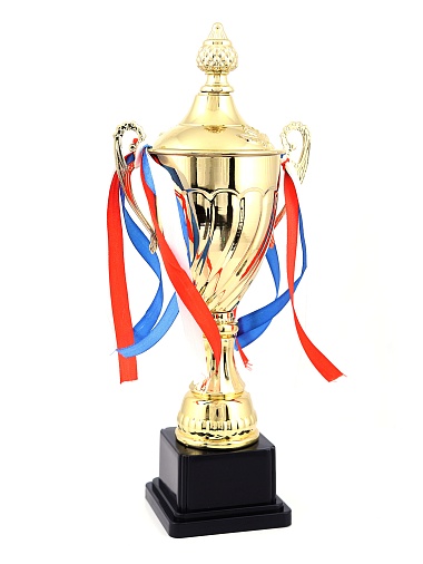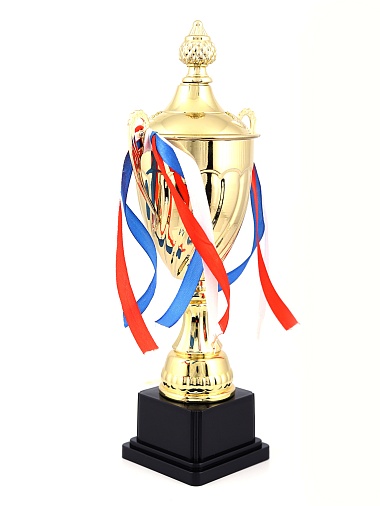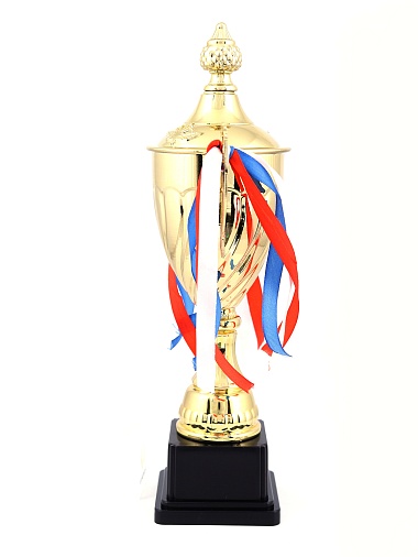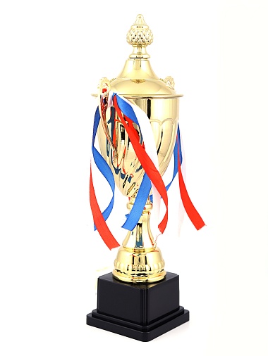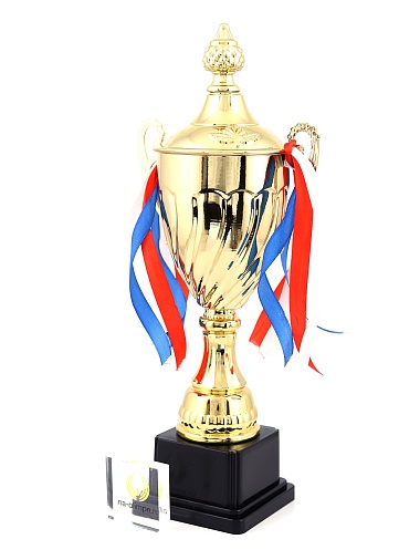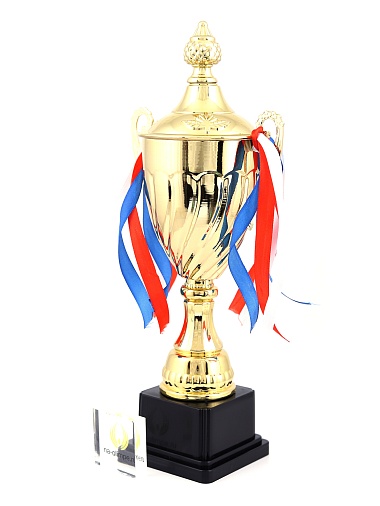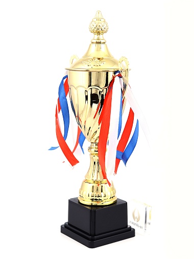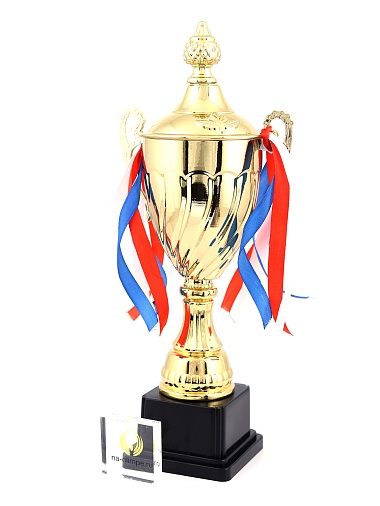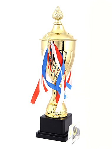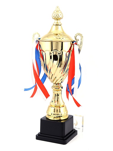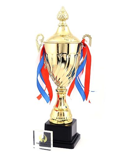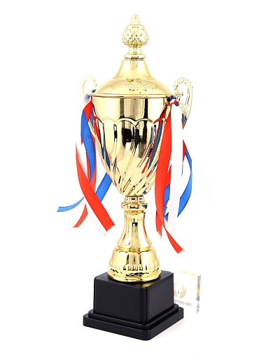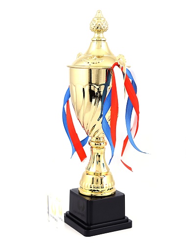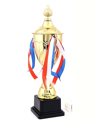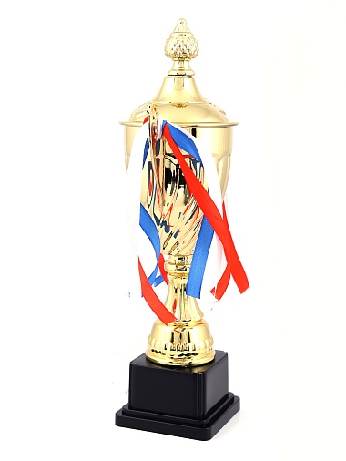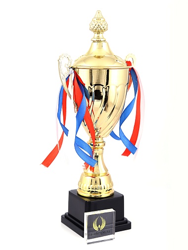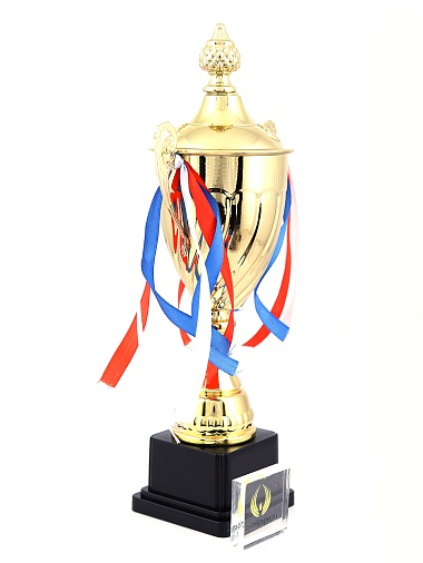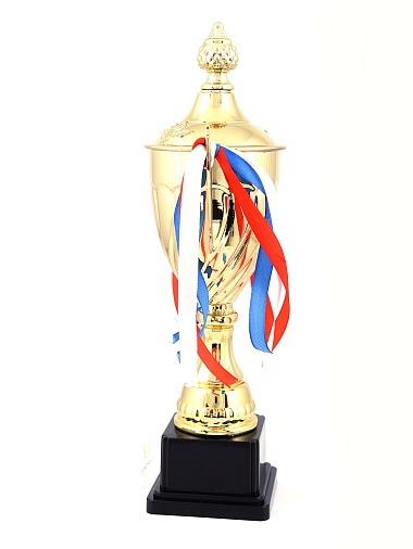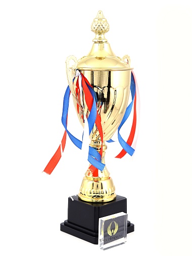Кубок с металлической чашей на пластиковом постаменте. Ленточки из полиэстера украшают ручки кубка, но при необходимости их легко можно снять.