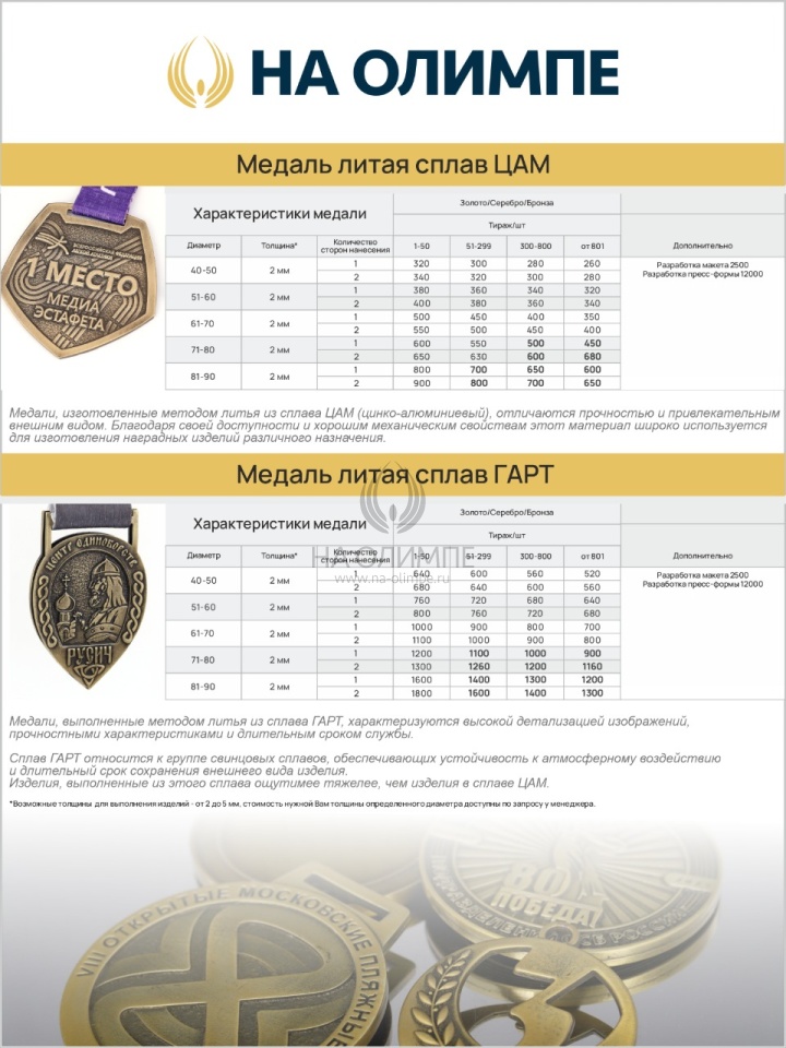 Изделия, выполненные из этого сплава ощутимее тяжелее, чем изделия в сплаве ЦАМ. Сплав ГАРТ прекрасно сохраняет форму и детали рельефа. Идеален для изготовления медалей премиального класса. Возможна любая форма и наполнение.