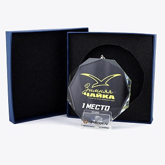 Медаль из стекла, толщиной 10 мм. с полноцветной печатью. Печать выполняется на uv-принтере уф-отверждаемыми чернилами. Изображение не выцветает и не желтеет со временем. Высокое качество печати позволяет наносить изображения с большой детализацией, любых цветов включая белый. Изображение наносится на медаль с двух сторон - с лицевой и с обратной. На лицевой части обычно наносится информационная часть макета (текст, логотип), на обратной части наносится фон, подобранный в соответствии с пожеланиями заказчика. Таким образом всё нанесение на медали наносится с двух сторон, а воспринимается только спереди. Благодаря печати с двух сторон достигается эффект объемного изображения: при небольшом повороте медали изображение на передней части движется относительно фона на задней стороне. Диаметр медали равен 100 мм. Вес медали без футдяра 195 гр. Поставляется в комплекте с подарочным футляром (цвет футляра и подложка могут отличаться), лента в комплект не входит и заказывается отдельно.