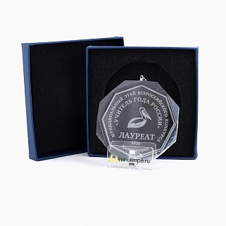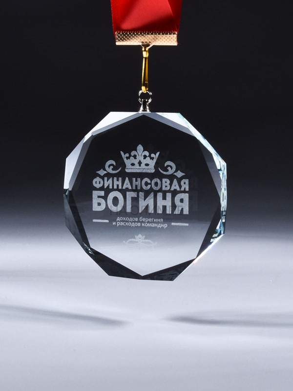 Медаль из стекла, толщиной 8мм. с нанесением лазерной гравировки. Лазерная гравировка производится на высокоточном оборудовании, что позволяет выполнить нанесение с практически любой степенью детализации. Гравировка не имеет видимого углубления внутрь награды, она выглядит и ощущается как матированное стекло. Диаметр медали равен 80мм.
