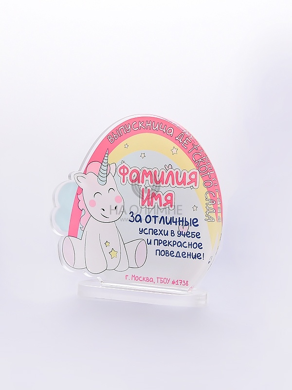 Выпускная награда выполнена из прозрачного акрила 6мм с полноцветной цифровой печатью текста по Вашему запросу.