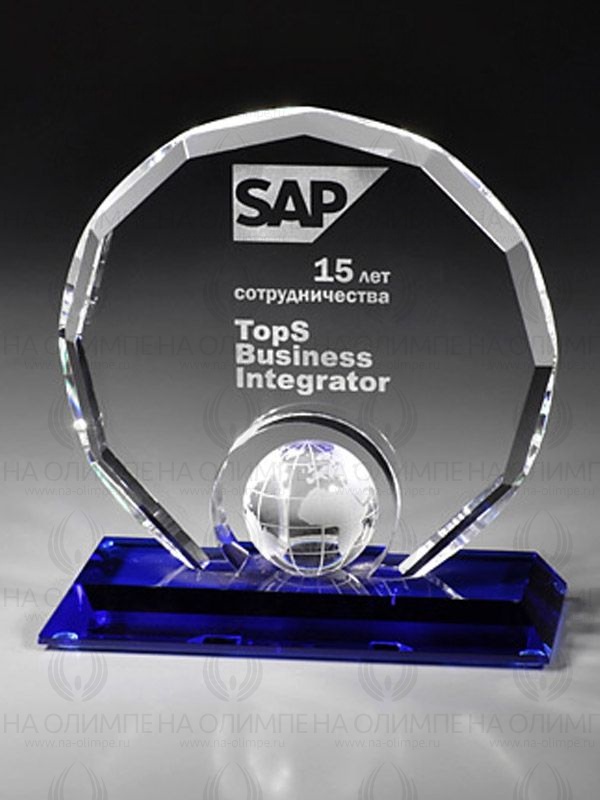 Приз из прозрачного и цветного стекла с лазерной гравировкой на постаменте в подарочной упаковке. Футляр из картона с покрытием из синей дизайнерской бумаги. Ложемент из драпированного шелка.