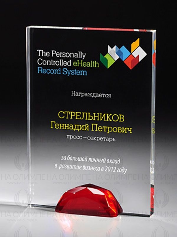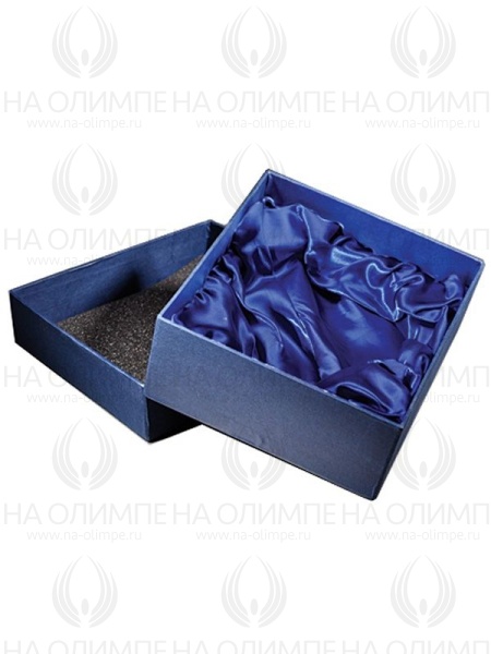 Приз из прозрачного и цветного стекла с цифровой печатью в подарочной упаковке. Футляр из картона с покрытием из синей дизайнерской бумаги. Ложемент из драпированного шелка.