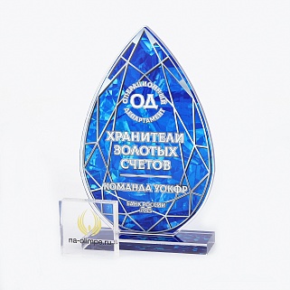 Приз из прозрачного акрила с глянцевой цветной печатью на лицевой стороне и полупрозрачной печатью на задней стенке награды и постаменте.
