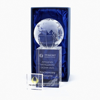 Награда из оптического стекла с гравировкой. Поставляется в комплекте с подарочным футляром. Вес награды без футляра 1547гр. Диаметр глобуса 79мм. Стоимость указана за нанесение на одной стороне. Возможность нанесения на дополнительной стороне и стоимость этих работ можно уточнить у менеджеров.