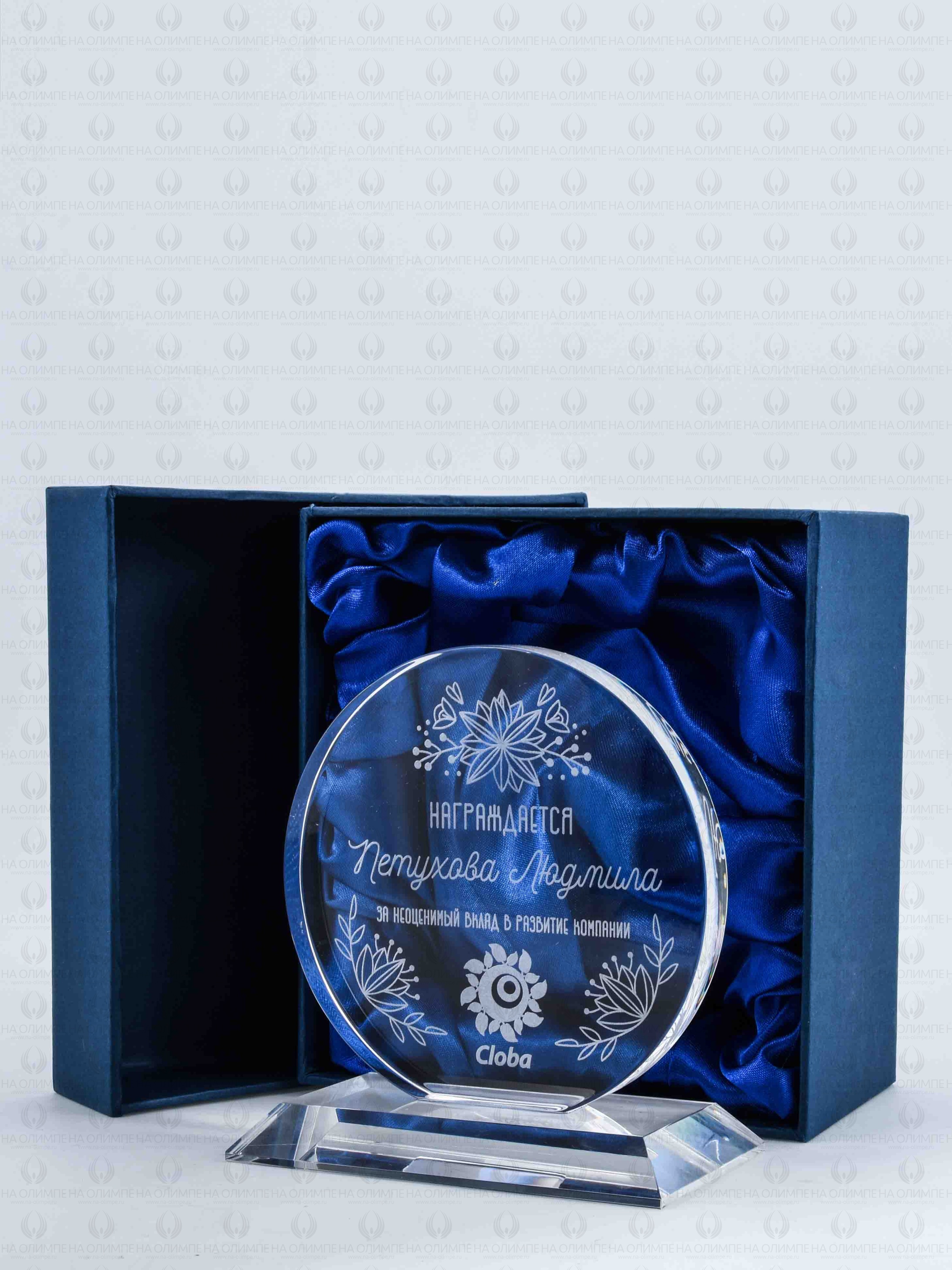 Стеклянная награда с гравировкой. Толщина стекла 13 мм. Поставляется в комплекте с подарочным футляром. Вес награды без футляра 470гр. Стоимость указана за нанесение на одной стороне, гравировка выполняется на задней стенке награды.