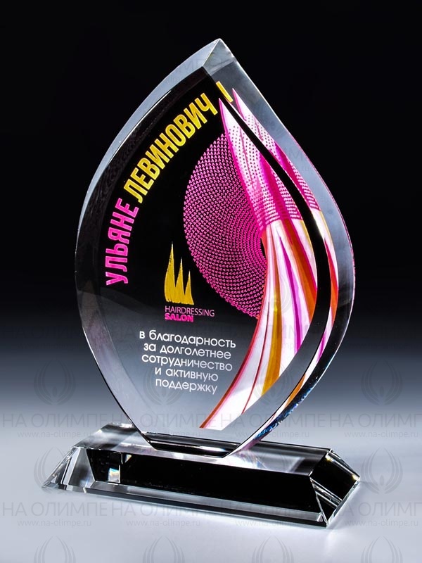 Стеклянная награда с полноцветным нанесением. Толщина стекла 19 мм. Поставляется в комплекте с подарочным футляром. Вес награды без футляра 1020гр.Стоимость указана за нанесение на одной стороне, печать выполняется на задней стенке награды.