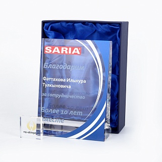Стеклянная награда с цветным нанесением. Поставляется в комплекте с подарочным футляром. Стоимость указана за нанесение на одной стороне, печать выполняется на задней стенке награды.