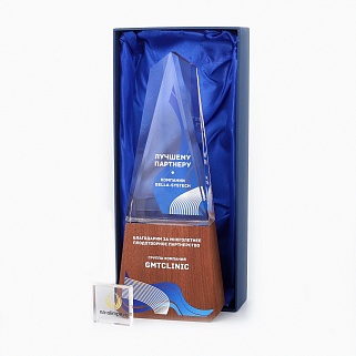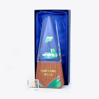 Стеклянная награда на деревянном постаменте  с цветным нанесением. Толщина стекла 36 мм. Поставляется в комплекте с подарочным футляром. Вес награды без футляра 1000гр. Стоимость указана за нанесение на лицевой и оборотной стороне награды.