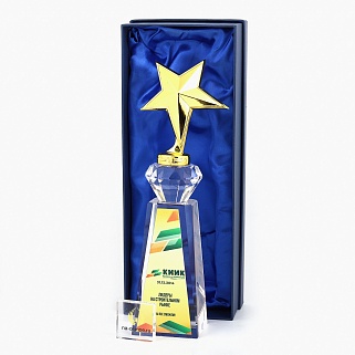Стеклянная награда с металлической звездой и цветным нанесением на постаменте. Поставляется в комплекте с подарочным футляром. Вес награды без футляра 1330гр.