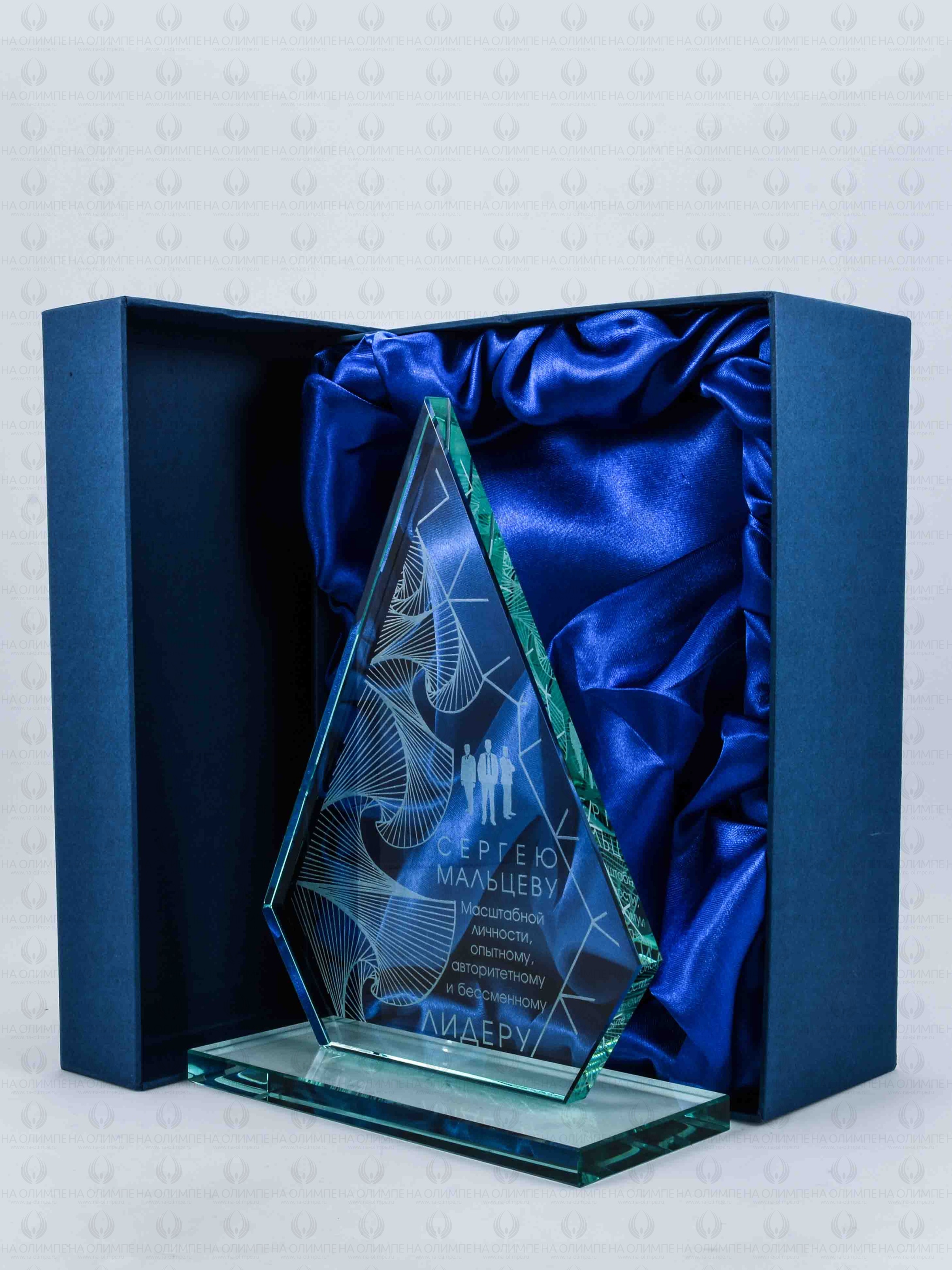 Стеклянная награда с гравировкой. Толщина стекла 12 мм. Поставляется в комплекте с подарочным футляром. Вес награды без футляра 1100гр. Стоимость указана за нанесение на одной стороне, гравировка выполняется на передней стенке награды.